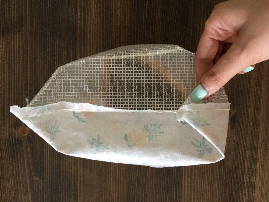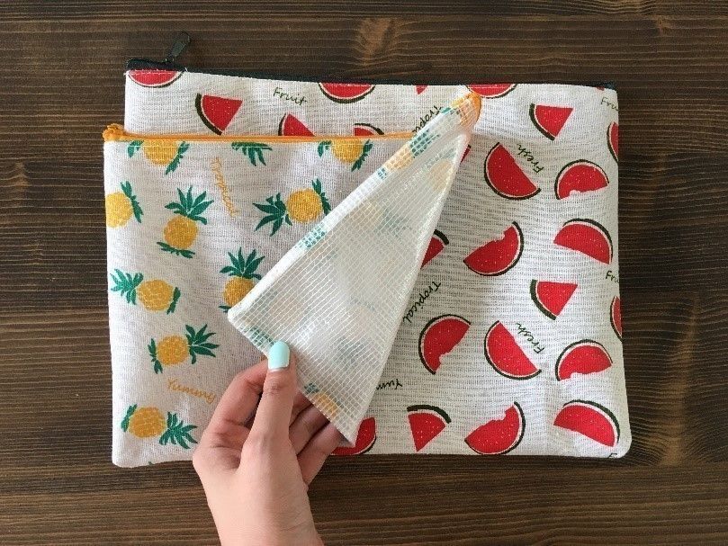 セリアの「ファスナーケース(フルーツ柄)」。ビニール製で文房具コーナーに置いてあるこのケースを使います。そのまま使わずこのケースの角を内側に折り込みマチを作ってクリアバッグにイン!A5サイズがぴったりです。
