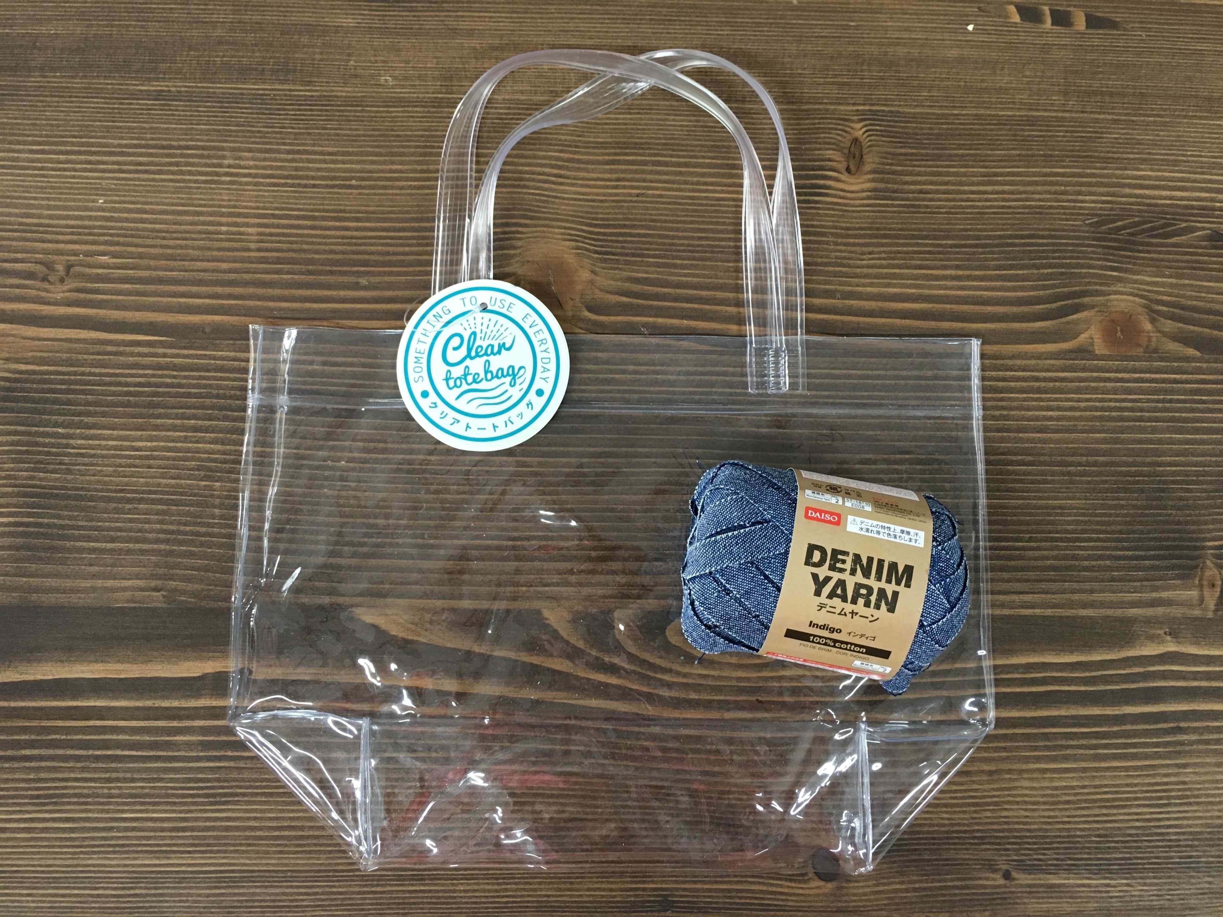 セリアの「クリアトートバッグ」。A5サイズの書類がぴったりの小さめサイズ。夏のお出かけに便利なビニール製ですがそのまま持つとちょっと寂しいのが難点!