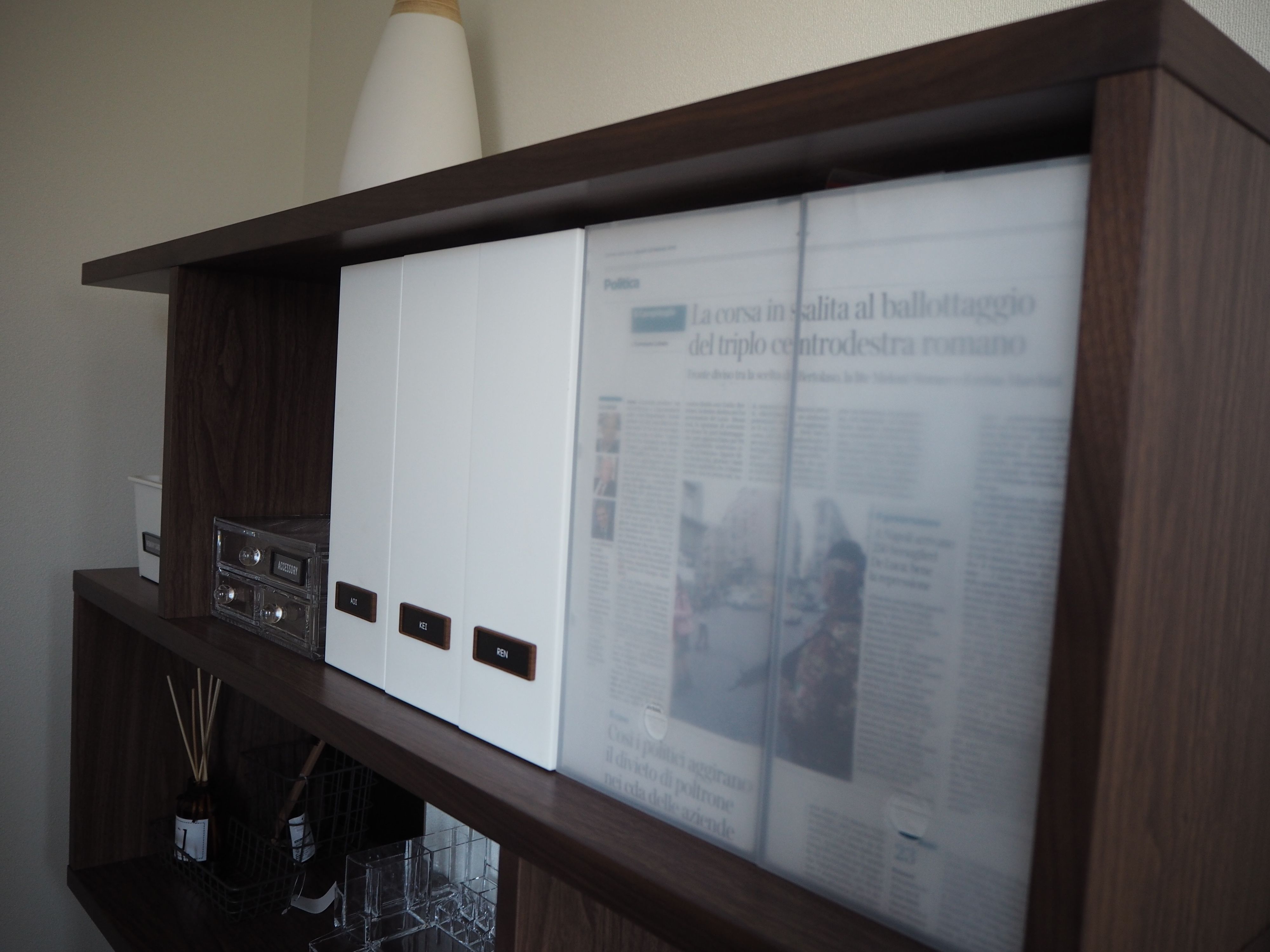 半透明で中身が見やすいのが便利なところ。しかし入れるモノによっては隠したい時もありますよね。そこで、内側から100均でも買えるイタリア語新聞や黒の画用紙を貼るだけでグンっとスッキリ感アップ!高見えしちゃいます。