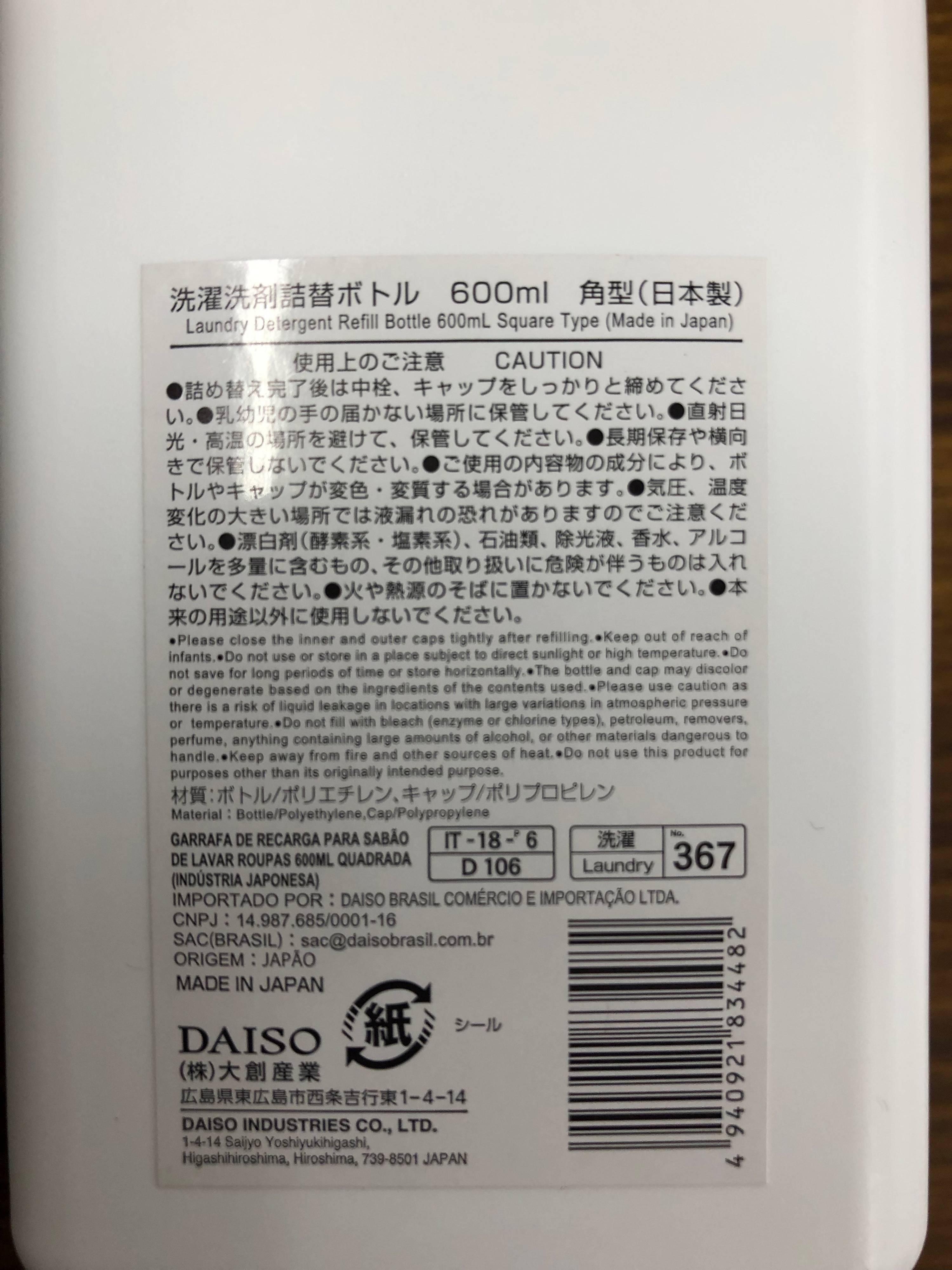 容量は600mlと市販の洗剤詰め替えサイズの480~500mlよりちょっと大きめでちょっと残量があるけれど詰め替えたい!という時にも安心サイズです。