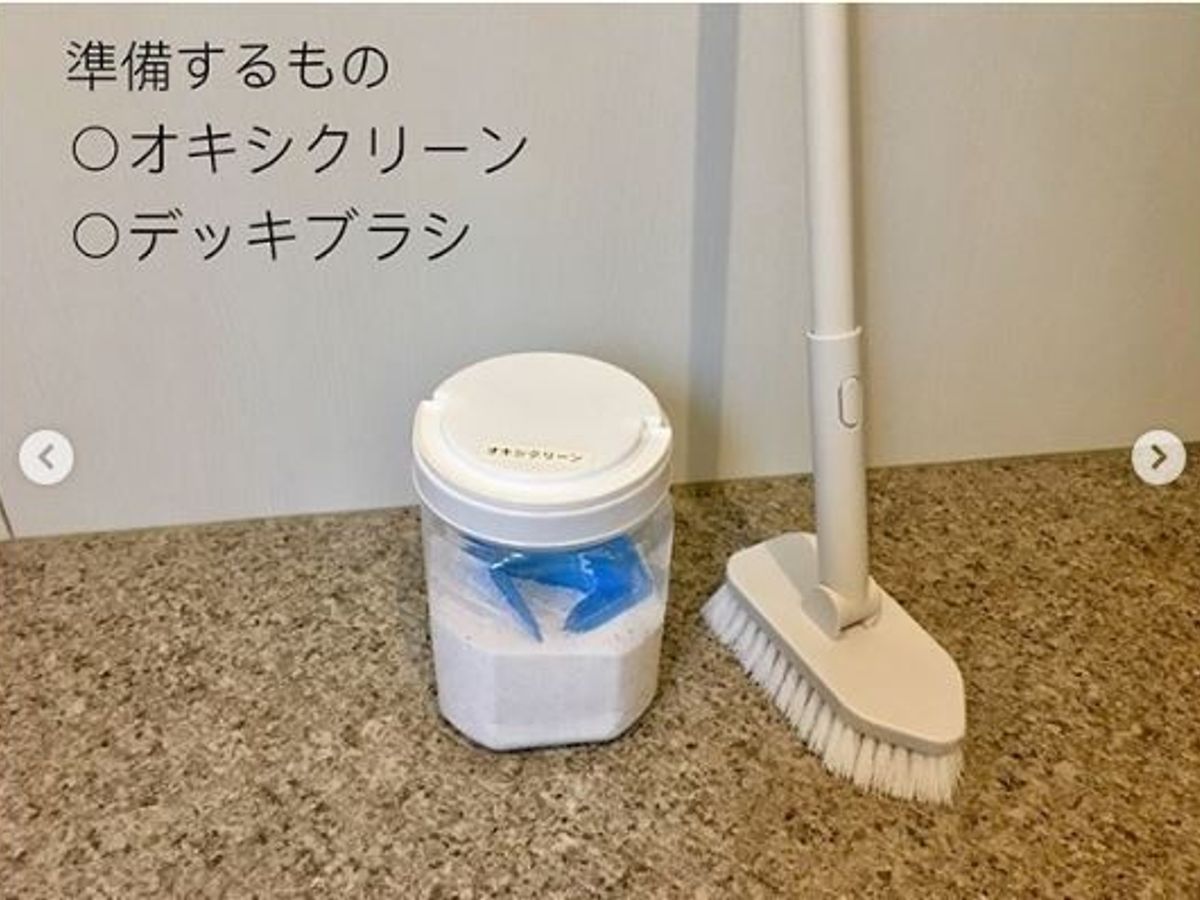 排水口をビニール袋などで止水したあと、オキシクリーンを2~3杯床にまき、60℃のお湯を全体的にかけて4時間放置します。水を流したあとデッキブラシで擦れば完了です。オキシクリーンは酸素系漂白剤なので嫌な臭いもなく使いやすいですね。