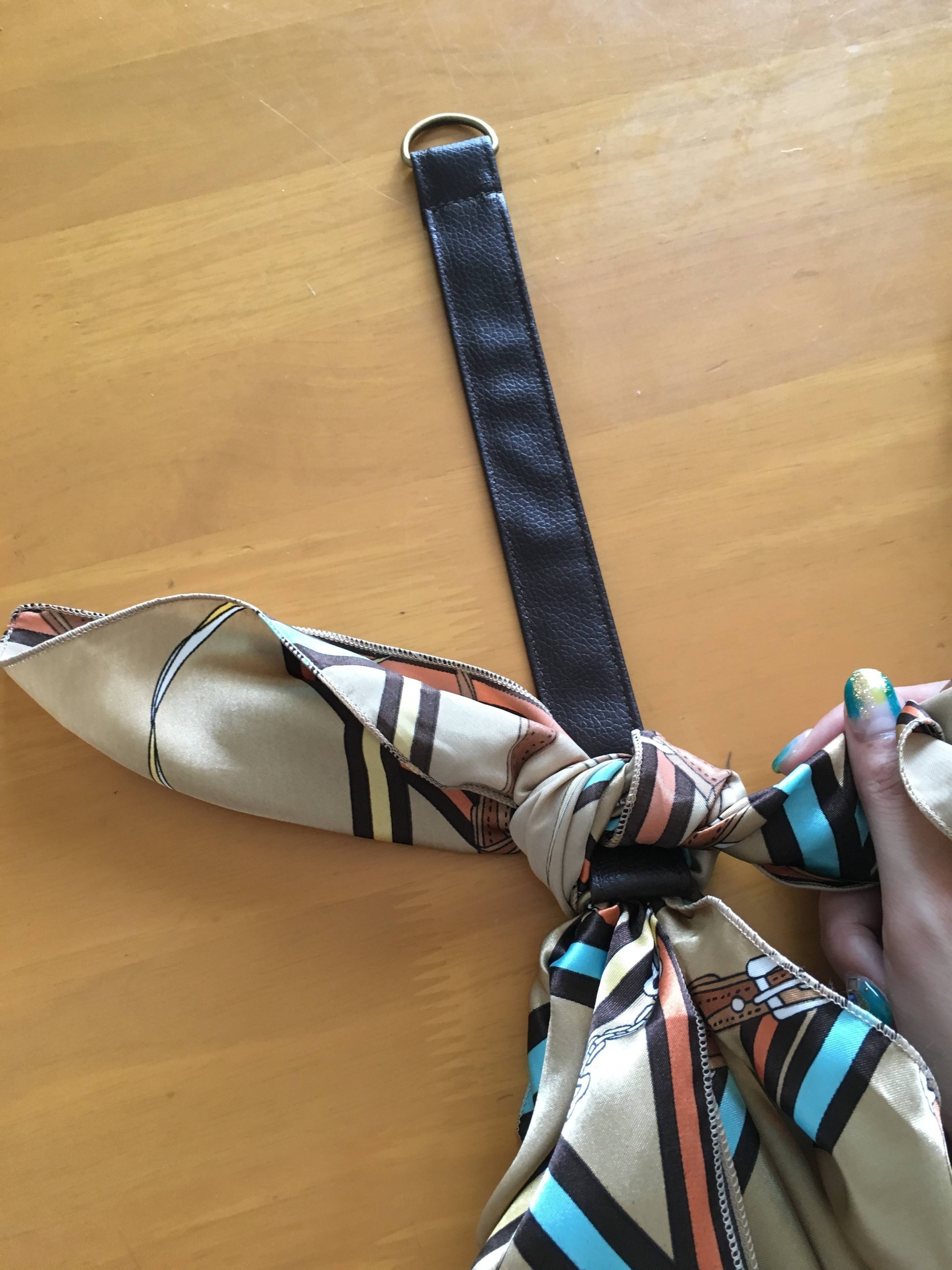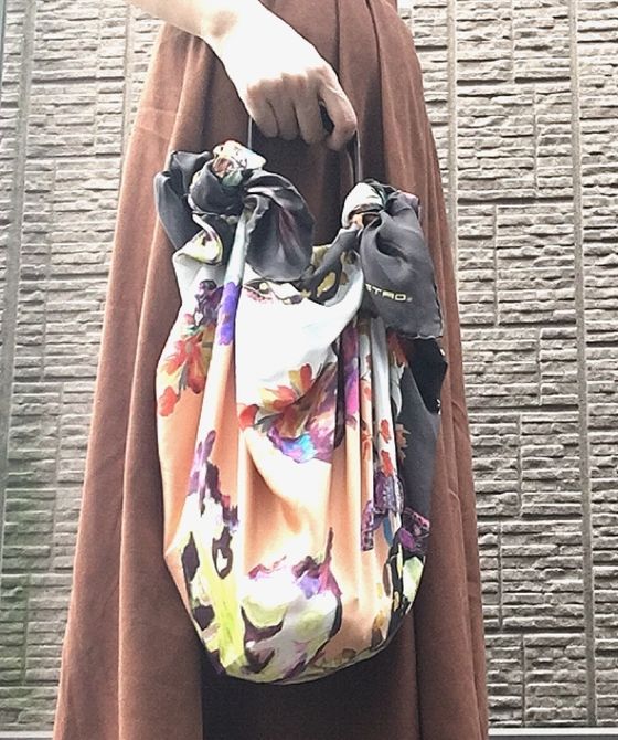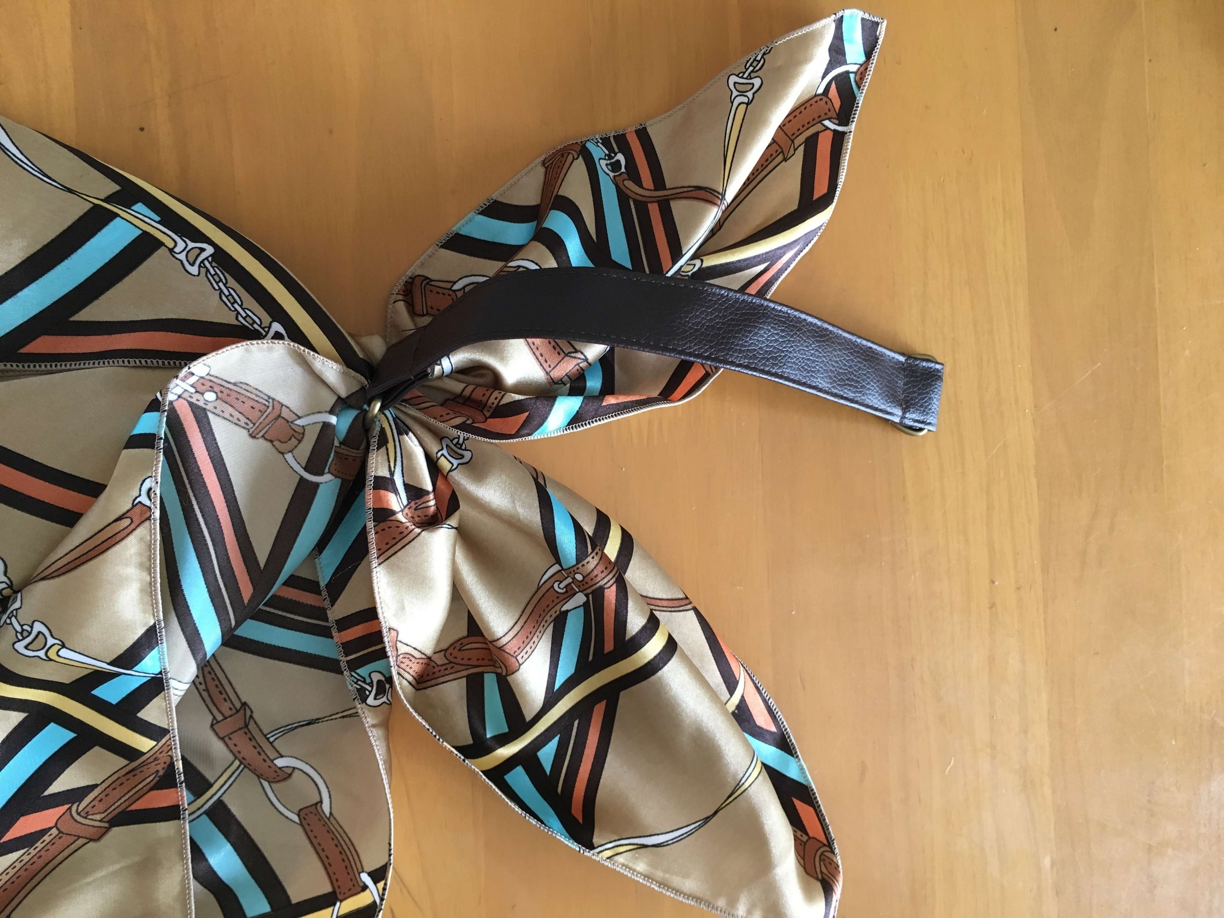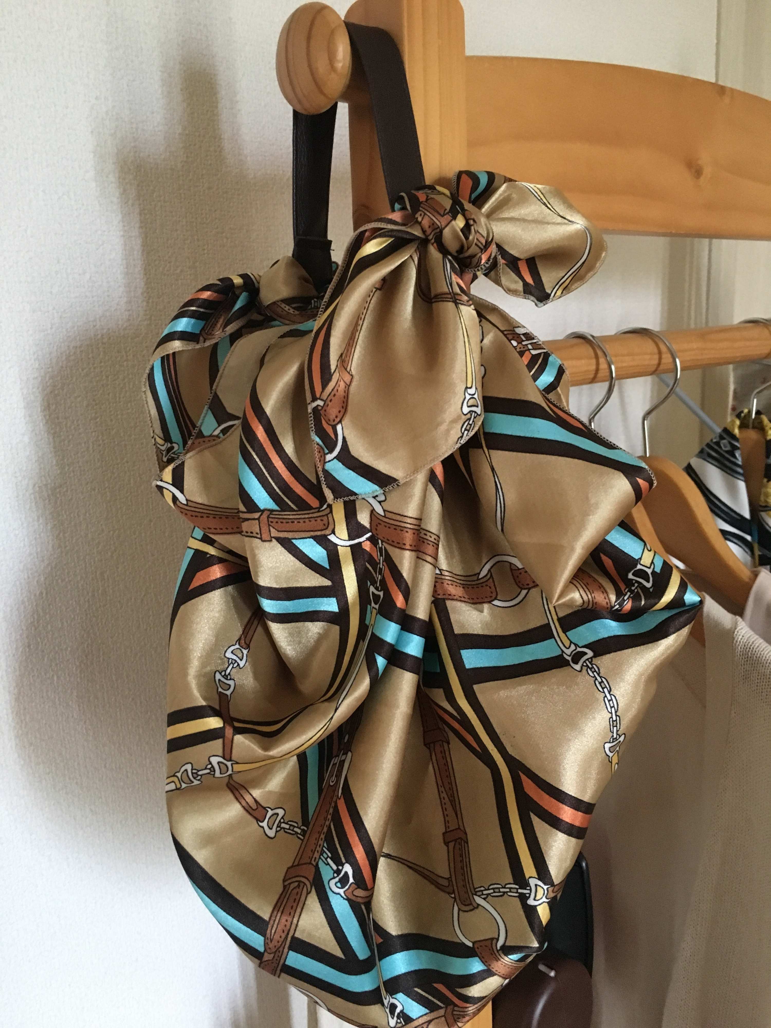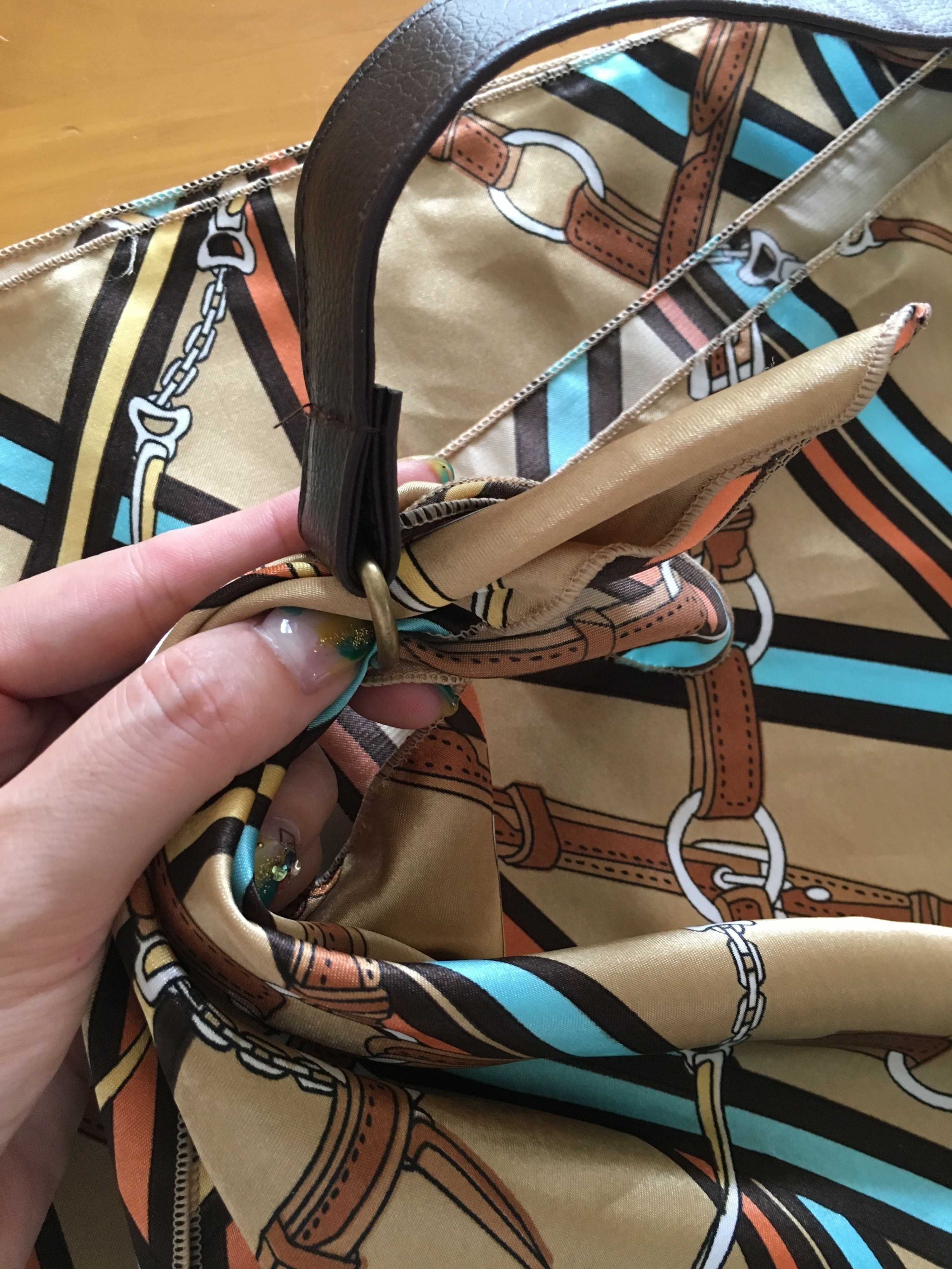 ハンドルの色と同じ茶色が使われているスカーフで作るとなじみやすいですよ。