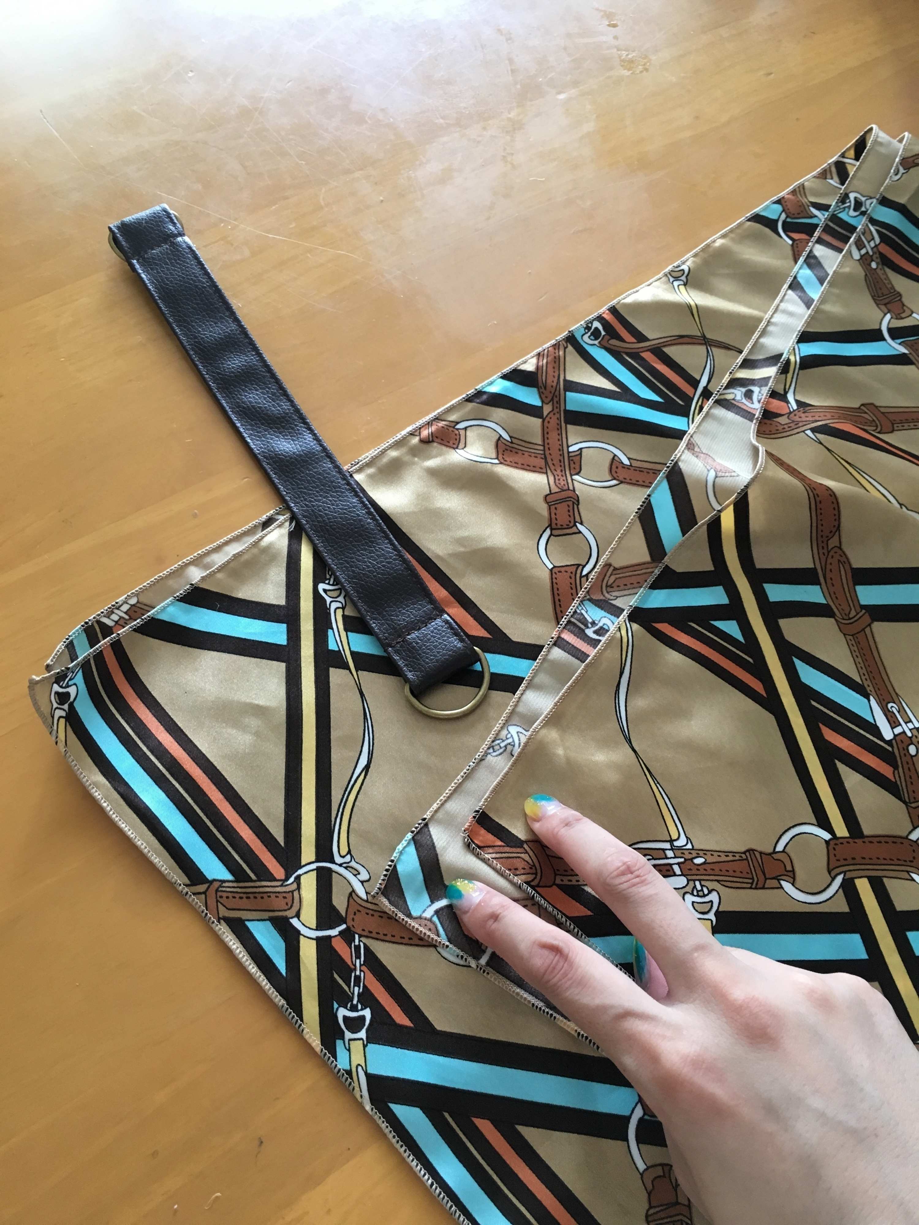 スカーフを4つに折って、スカーフの端の4つ角のうち上の2つをハンドルの金具部分に手前から通します。