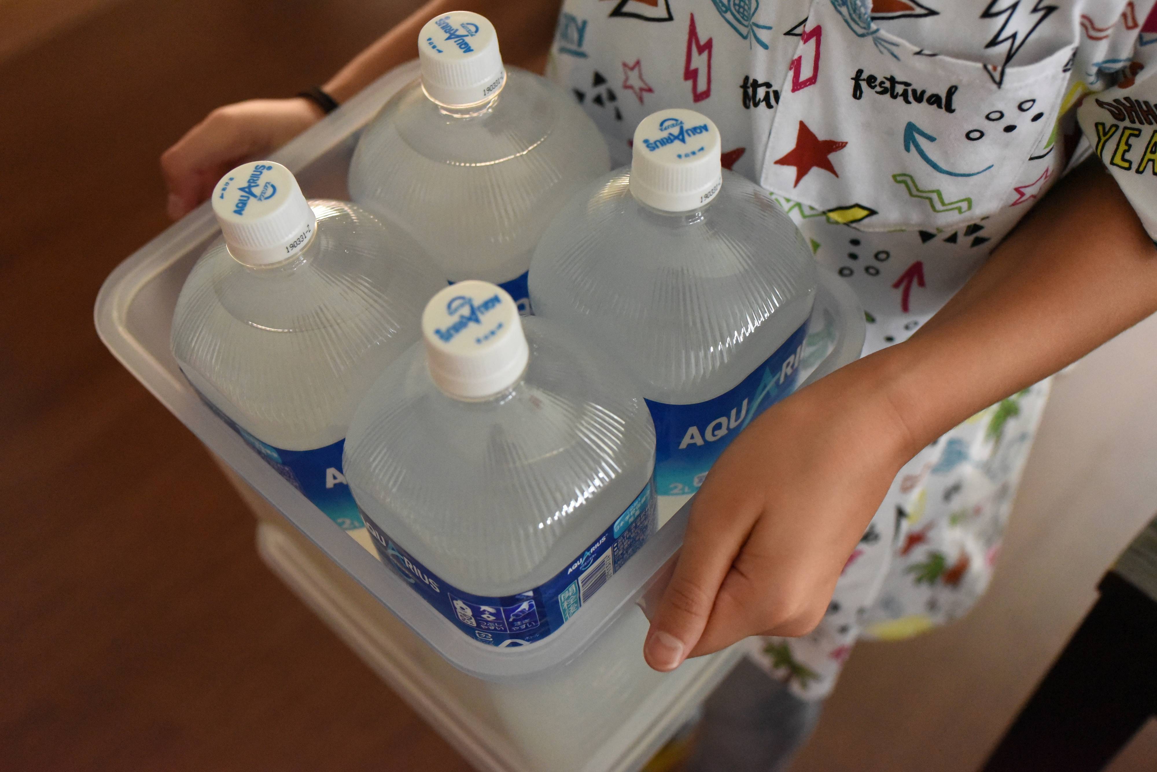 小サイズには500のペットボトルが6本入ります。こちらも持ち手付き。ペットボトルだけでなく、お米や缶詰などの重量のあるものを入れたときには、片手では持ち上げられないので、ありがたいです。