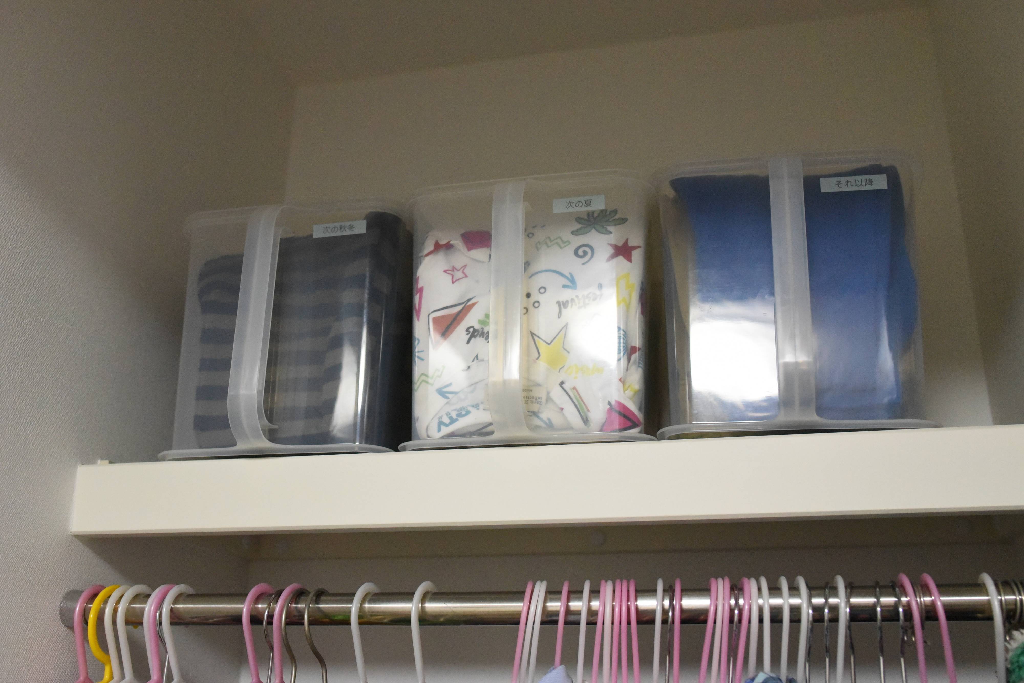 子供のクローゼットにあるハンガーポール上の棚で、おさがりでいただいた服や、季節終わりのセールで購入しておいた服を収納しています。
