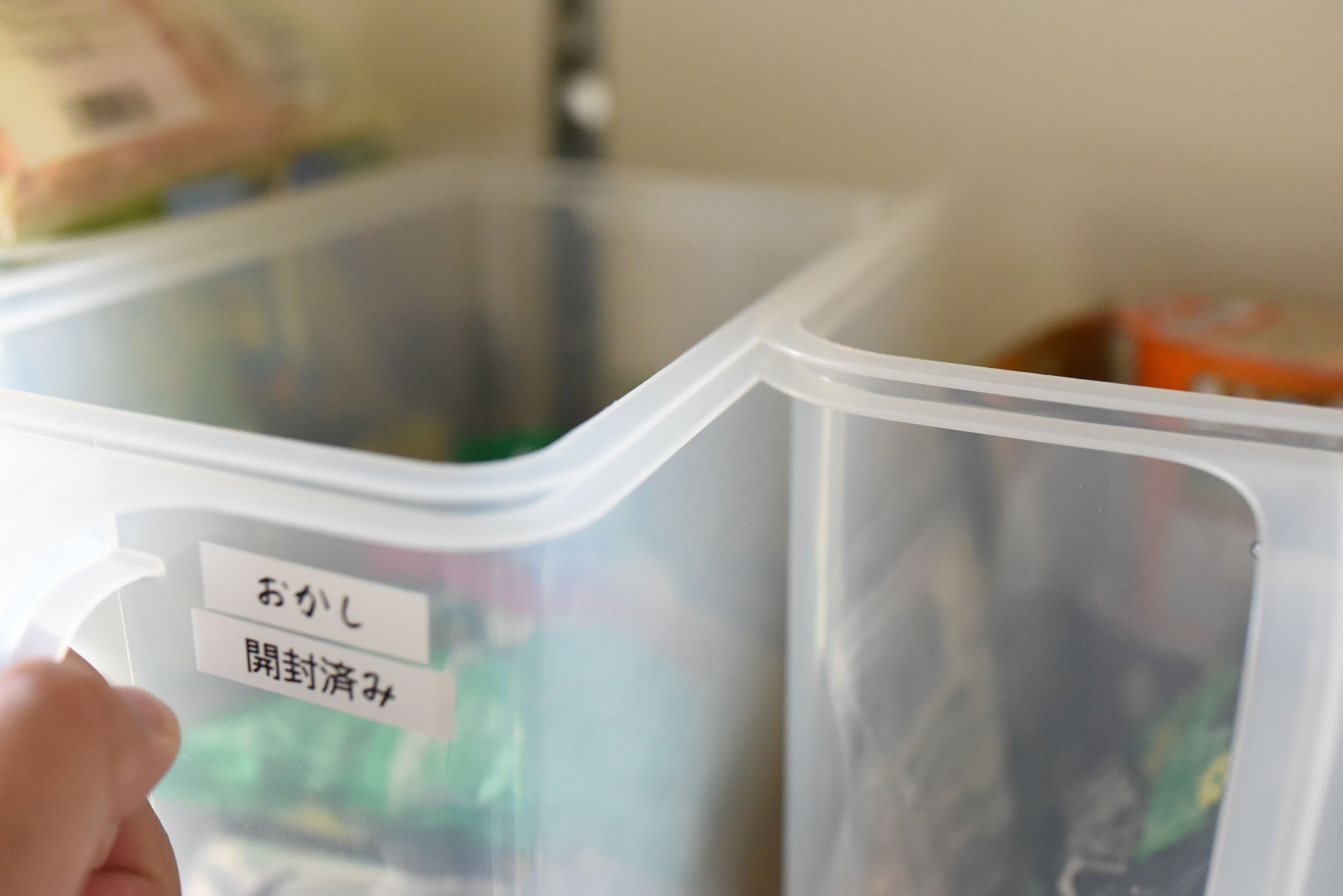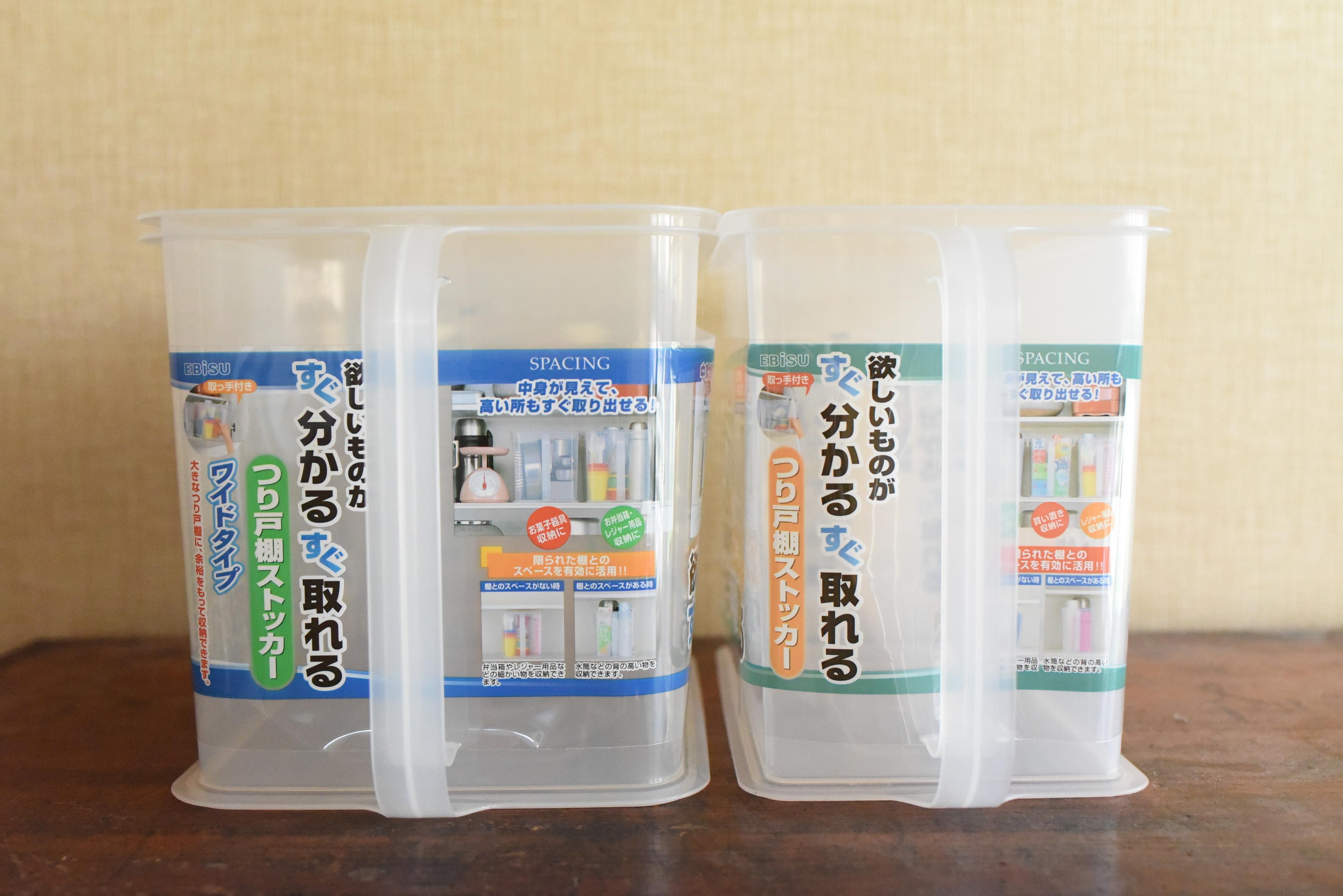 中身が見えて、高いところにおいても取り出しやすいので、パントリーに食品在庫を入れて、並べて使用しています。