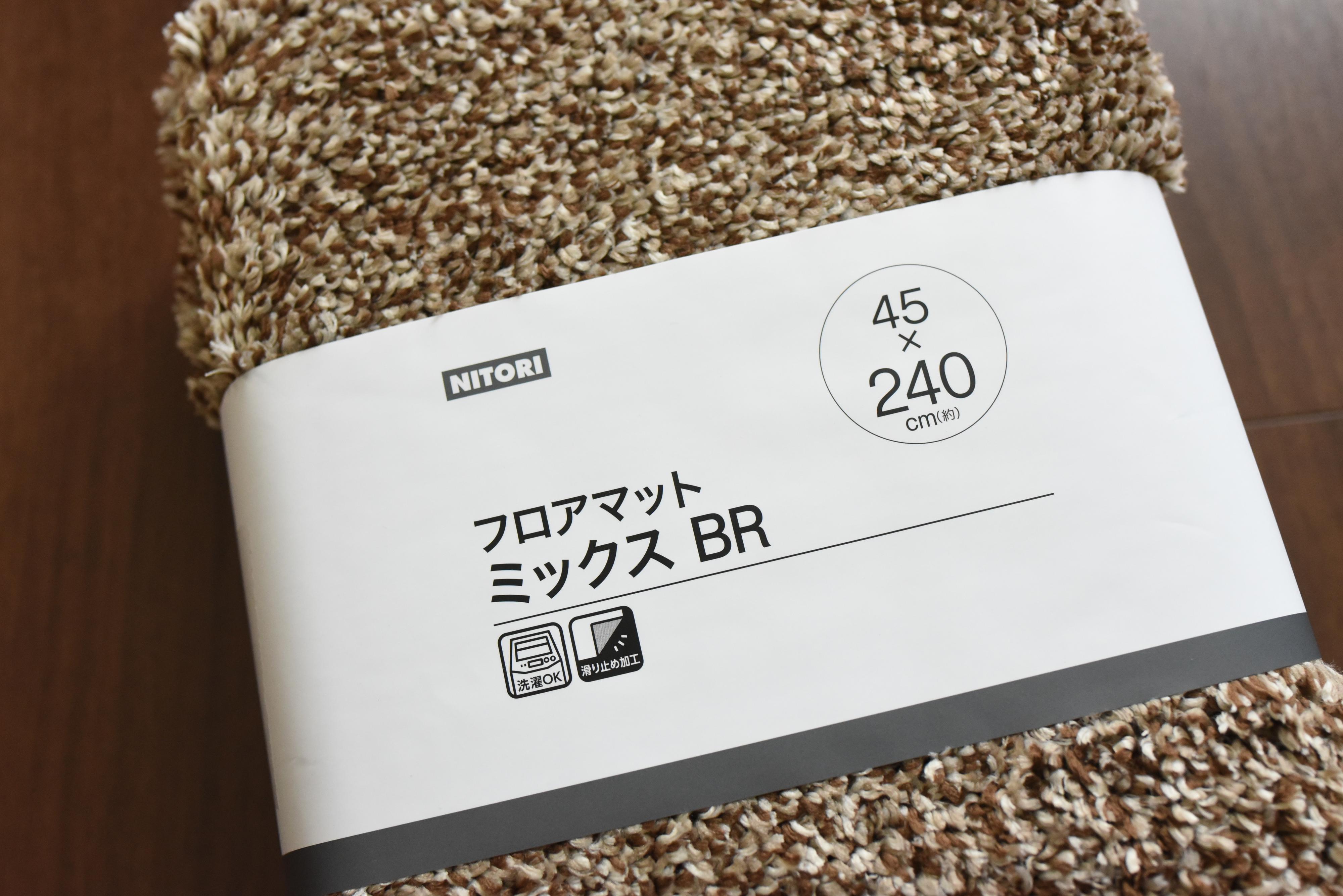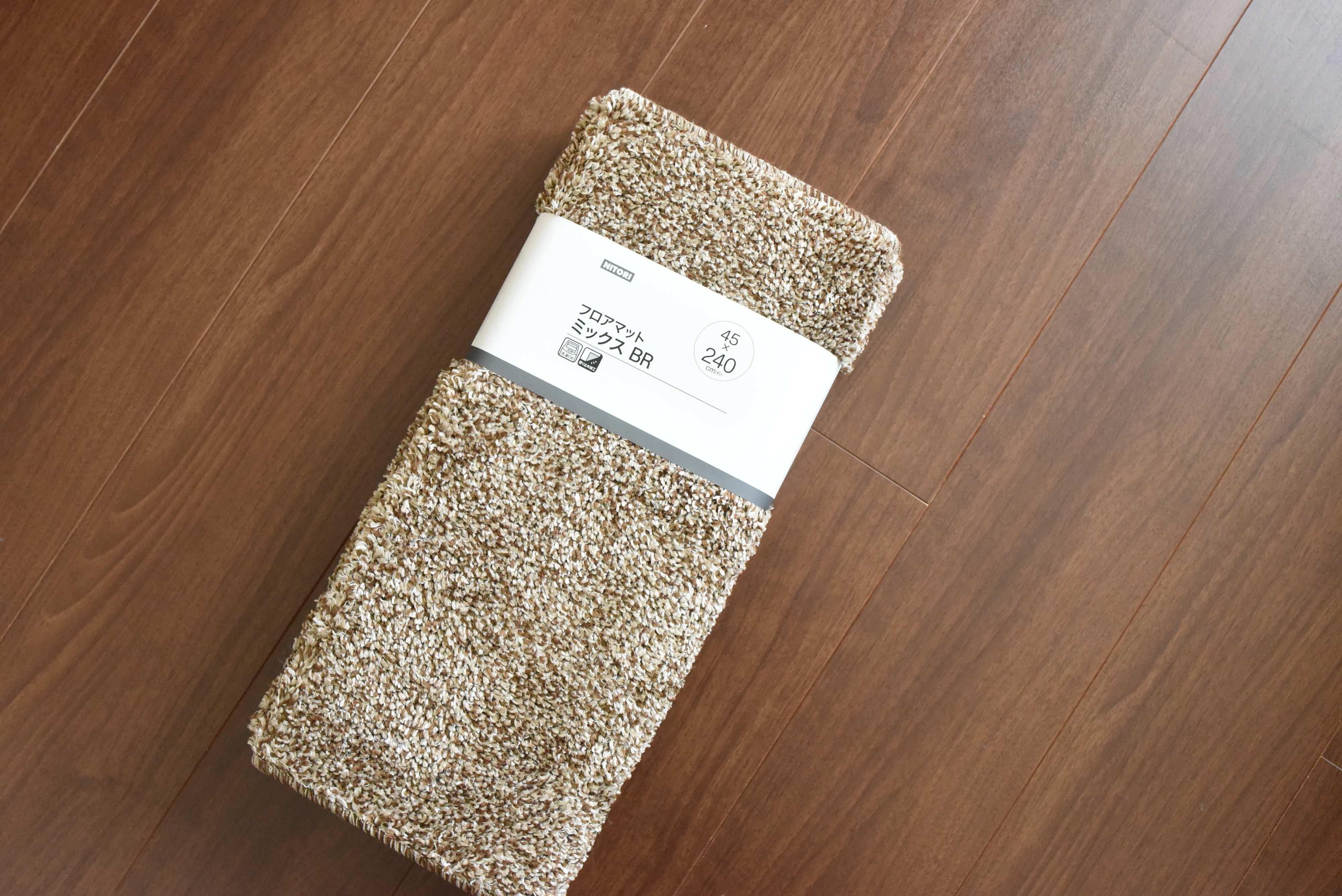値段はデザインや素材によって異なりますが、床の色に合わせて購入したこちらのマットは、240cmタイプで、1380円(税抜き)。ふんわり程よい厚みがあり、素足で触れたくなるさわり心地です。