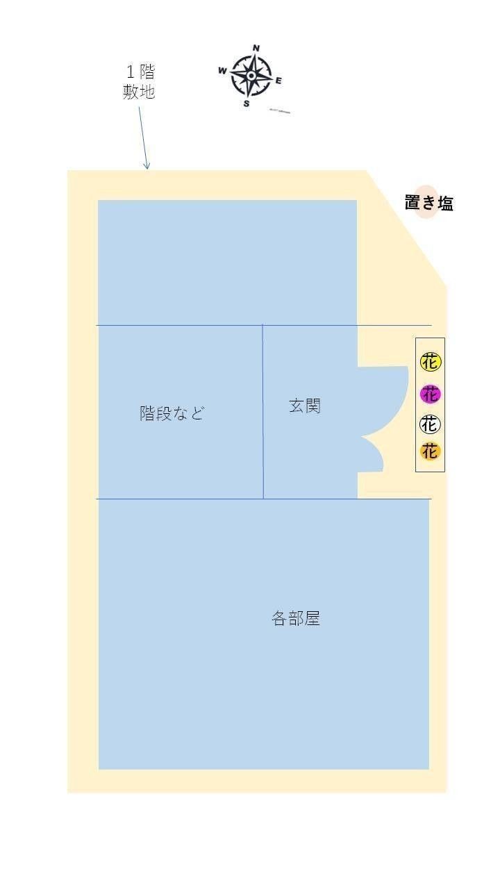 東北には置き塩を、玄関には黄、ピンク、白、オレンジでダメージをカバー
