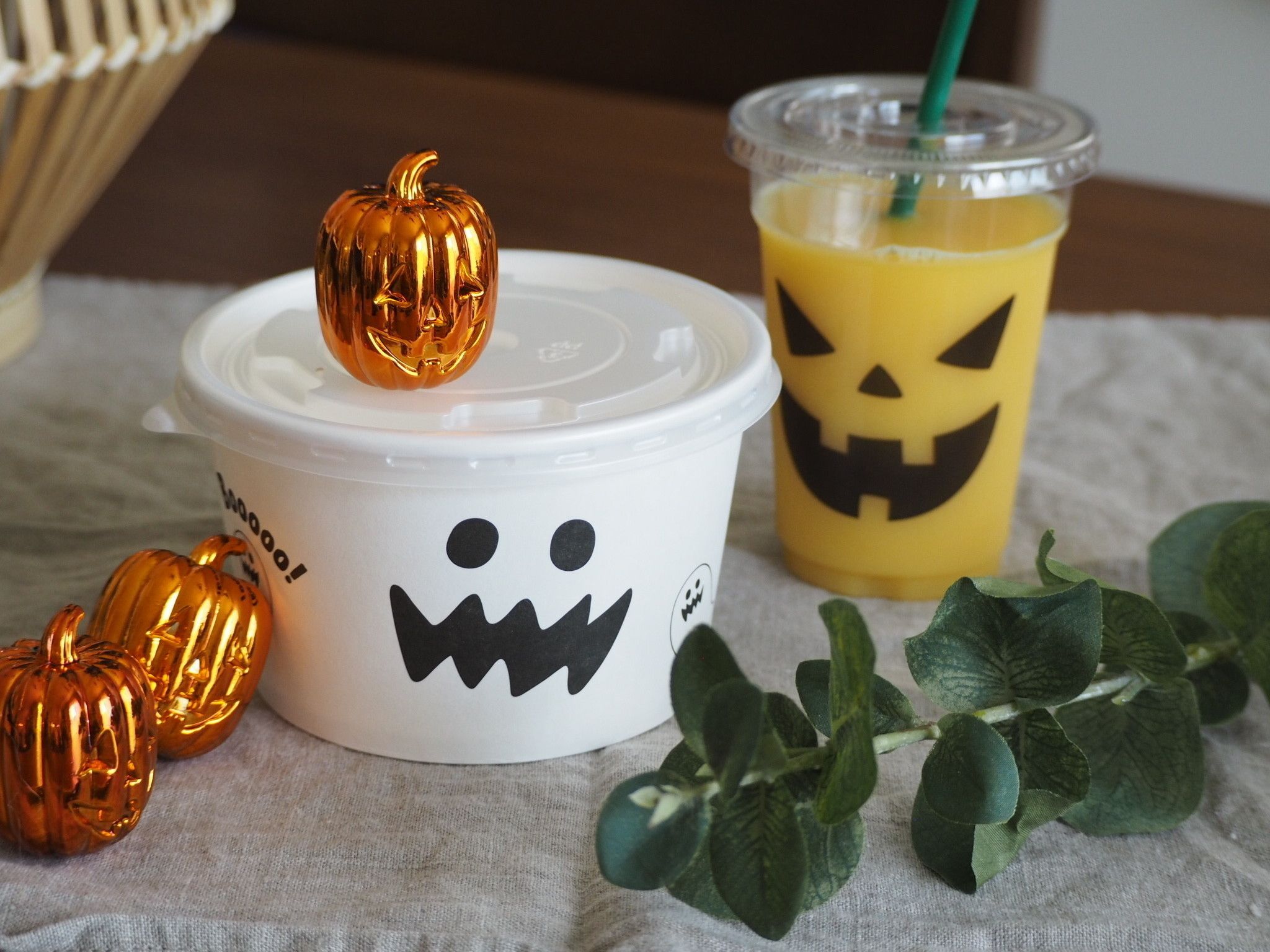 セリアの「フタ付きクリアカップ ハロウィンパーティー」と「フタ付きポップコーンカップ」はジャックオーランタンとお化けのモチーフで置いておくだけでハロウィン気分!