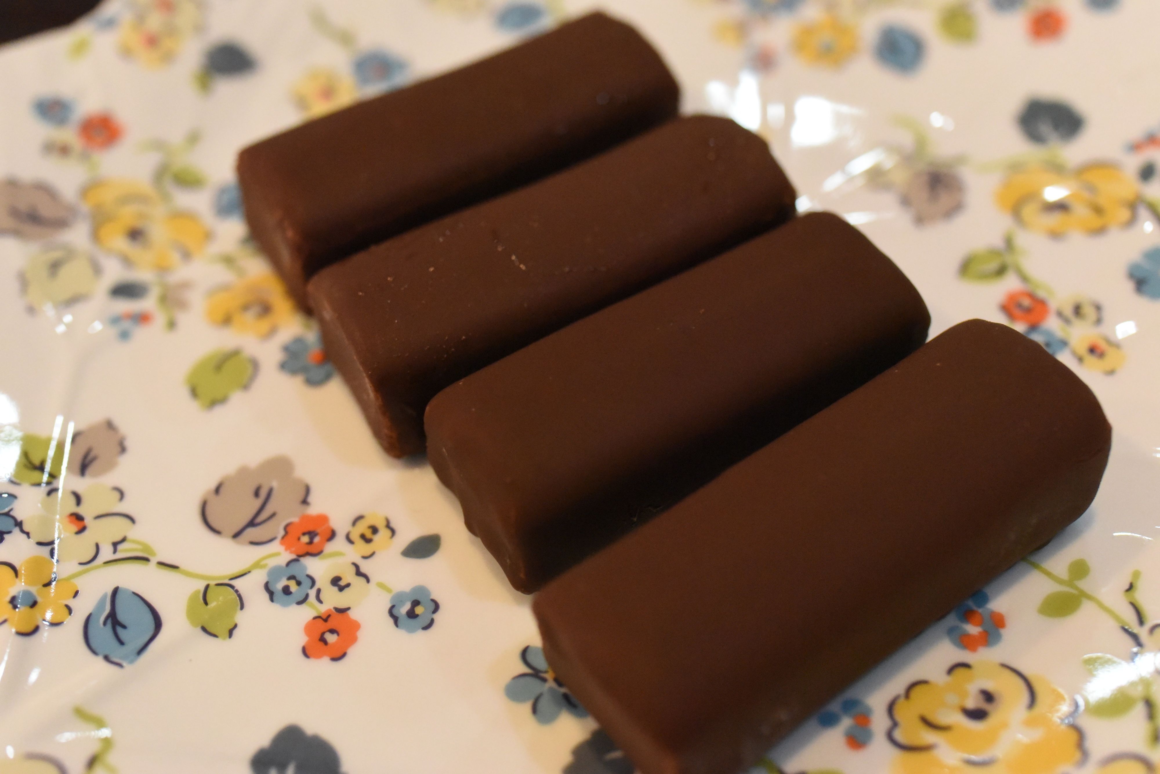 長さ7㎝、厚み2㎝。パリパリのチョコレートでコーティングされています。パッケージを開けてしまうと、同じ見た目で味の違いを見分けられなくなってしまうので、パッケージのままテーブルに出して、選んでもらうといいでしょう。ケーキなどのデザートと違ってとりわけの皿やカトラリーを用意する必要もないので、手軽に出せますし、味を選ぶ楽しさもあって盛り上がること間違いなし!オススメです。