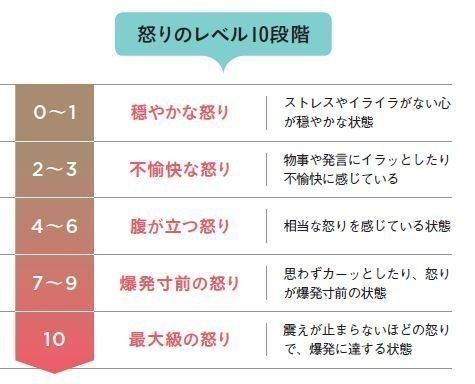 イライラの原因を探り、怒りをコントロールするために、まず怒りの強さを数字で表してみましょう。下図を参考に怒りの強さを10段階に分類。イライラしたらそれがどのレベルなのかを考えます。イライラ度合いを数字に置き換えることで、自分の心と冷静に向き合え、過剰にイライラするのを防げます。