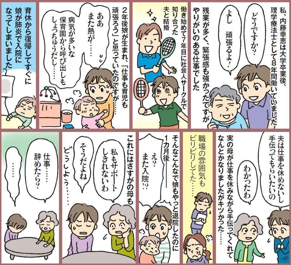 大学卒業後、理学療法士として病院に勤務。29 歳で結婚。31 歳で長女を出産し、育児休業を1年取得。復帰3カ月目に退職。専業主婦時代に資格を取り、現職に