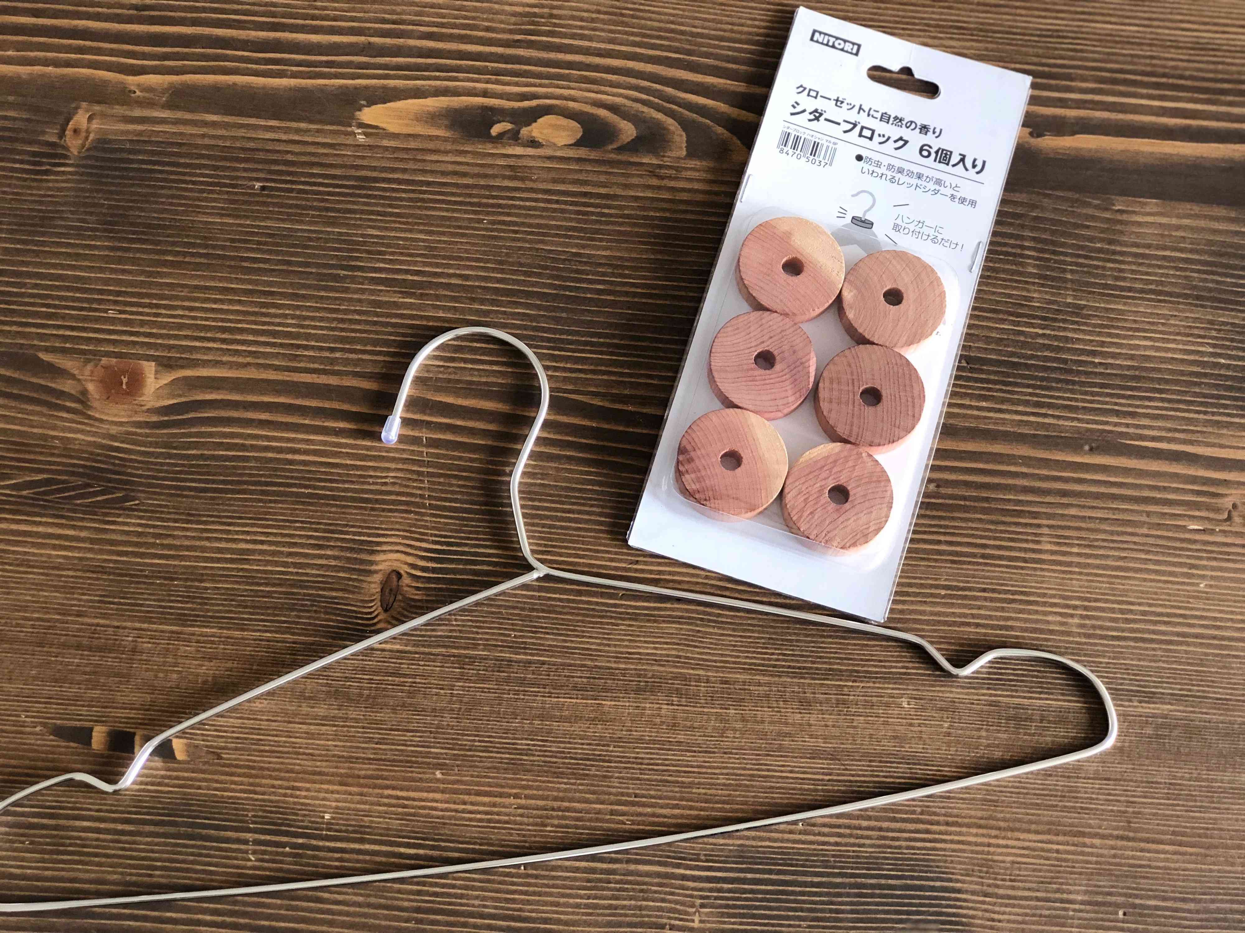 コロンとしたフォルムがカワイイシダーブロック。真ん中の穴にハンガーの軸を通せばいい香りで防虫対策できちゃいます。