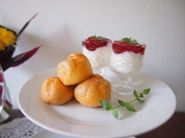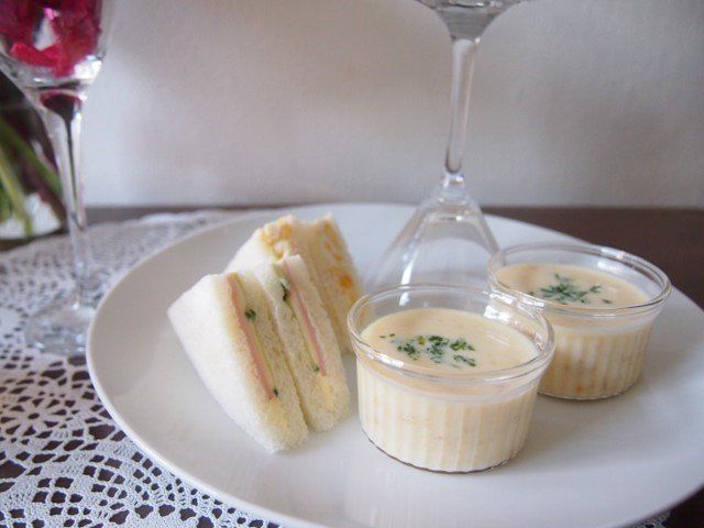 “ショットグラス”にはヨーグルトジャム、“耐熱ガラス製ココット”にはコーンスープ、プレートにはサンドイッチとシュークリームをのせました。