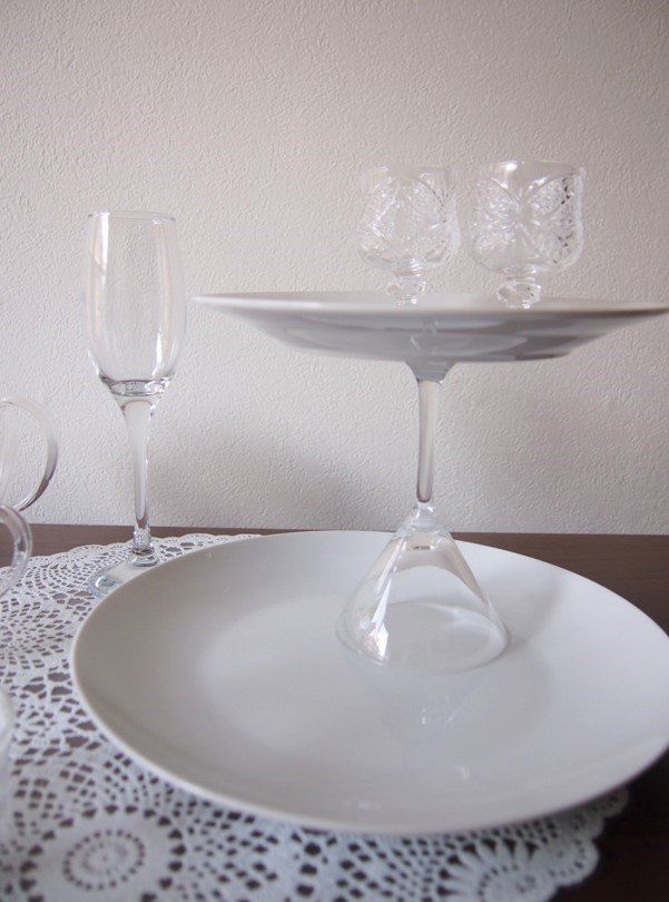 手持ちの大きめの丸皿にグラスを逆さに乗せて、その上から“ホワイトプレート”を重ねる。
