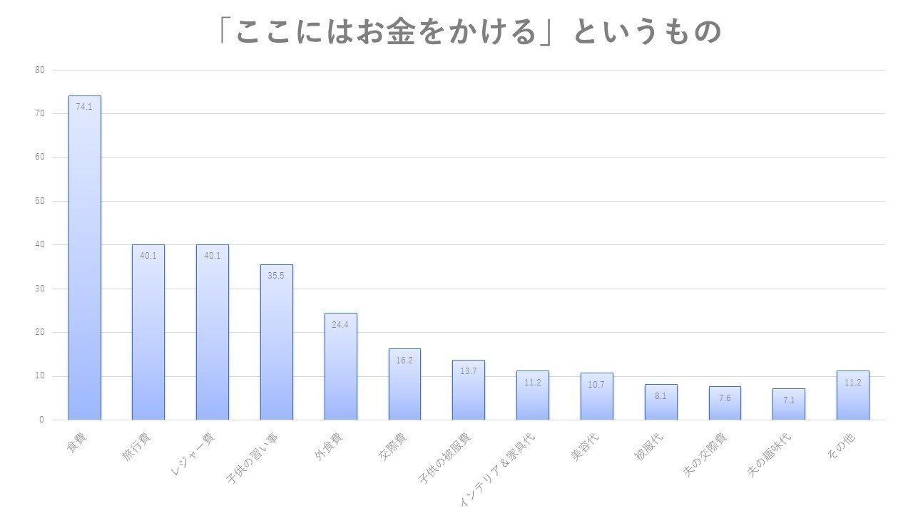 家計のなかで「ここにはお金をかける」というものを3つ挙げてもらったら、食費がダントツ、続いてレジャーと子どもの教育費という結果になりました。