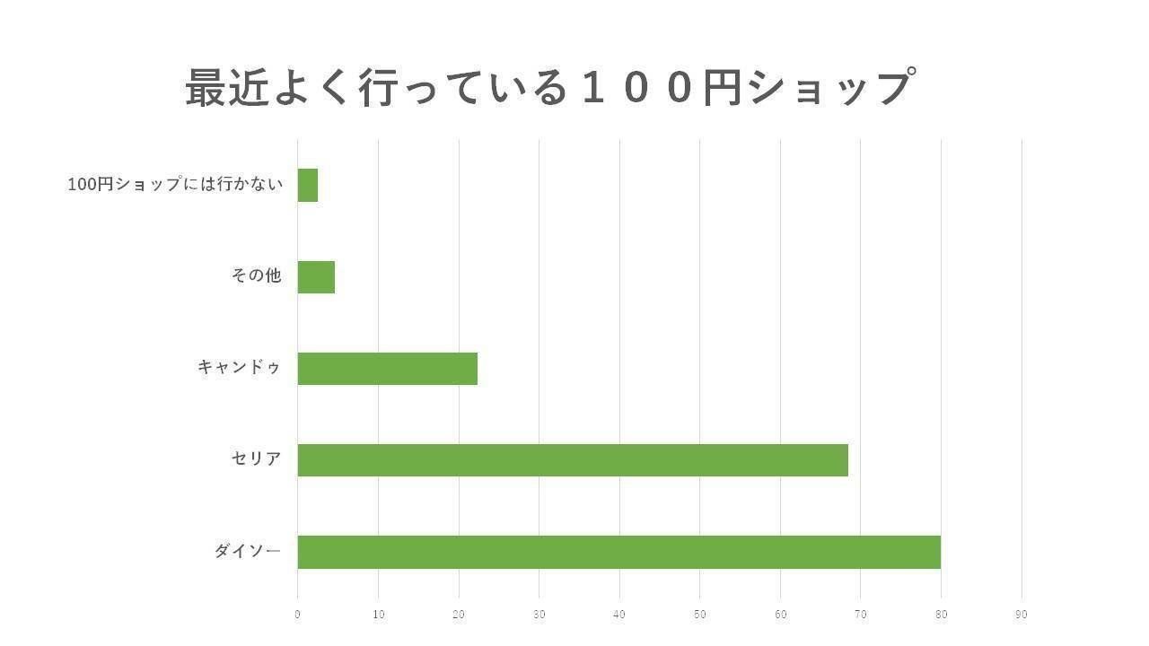 よく行く100円ショップを聞いてみたところ、ダイソーが79.7%、セリアが68.5%、続いてキャンドゥが22.3%という結果になりました。
