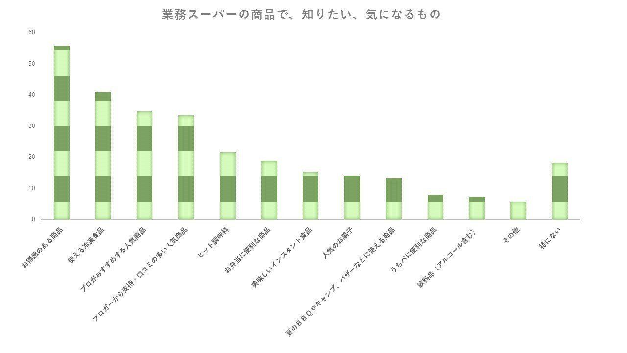「業務スーパーで知りたい&気になるアイテムをいくつでもあげてください」と聞いたところ、いちばん多かったのは「お得感のある商品」の55.7%。続いて「使える冷凍食品」の40.9%が続き、プロやブロガーなどが支持している商品も気になるようでした。