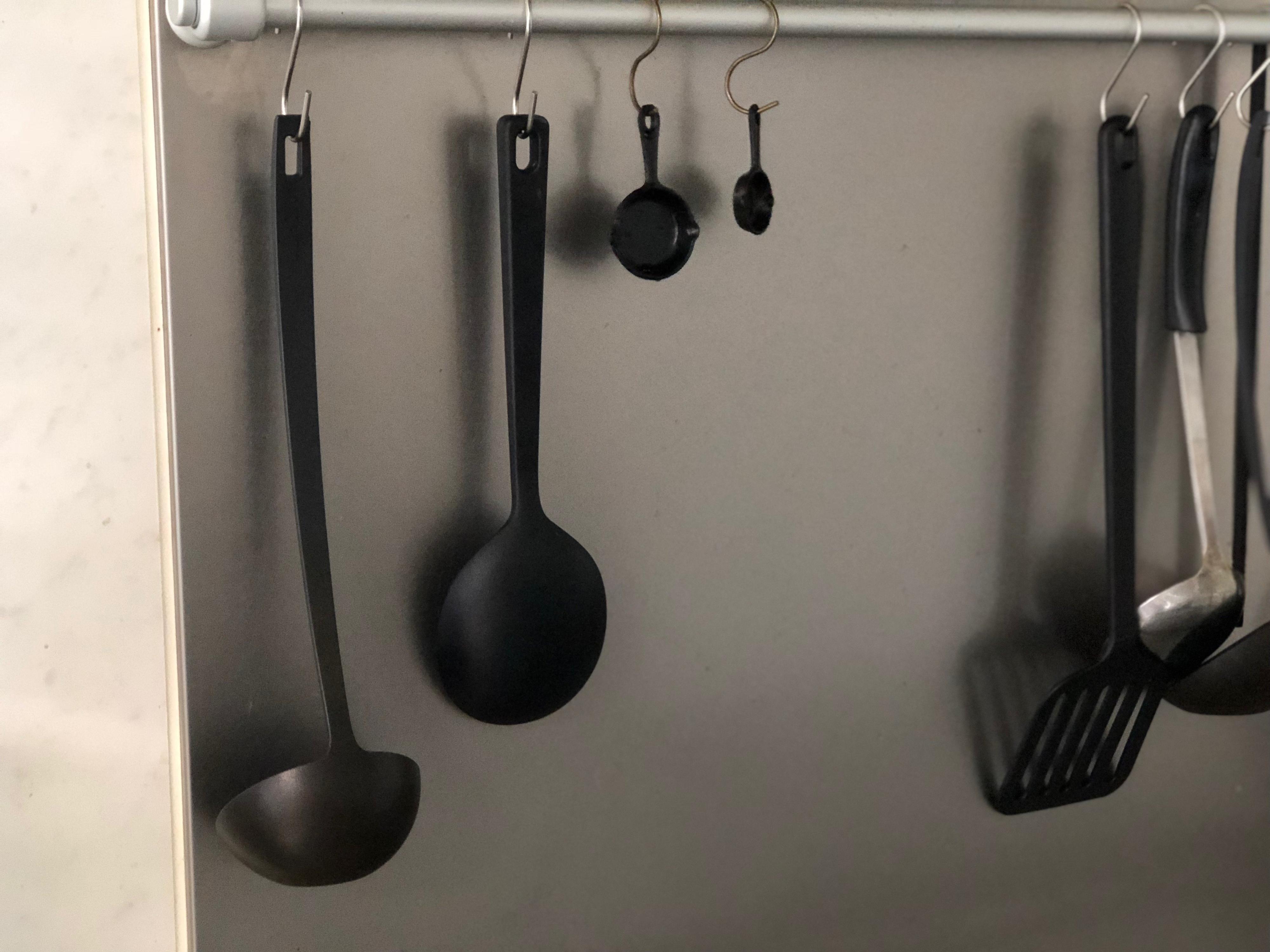 スキレットタイプは、持ち手に穴が開いているので、フックにかけてぶら下げ収納が可能です。ほかの調理器具の色をそろえて見た目で楽しむのもいいですね。