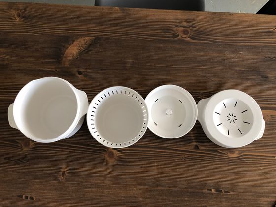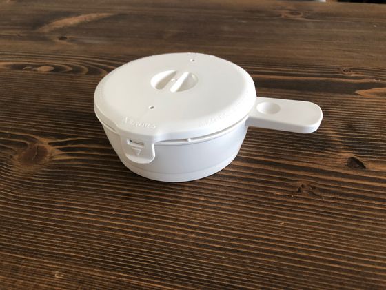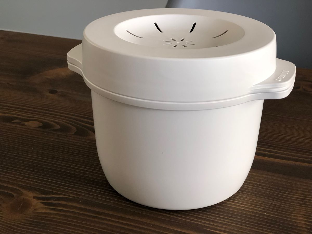 中蓋と、上蓋をしっかりしめたら、500Wのレンジで12分間チンするだけ!あとは10分蒸らすだけです。