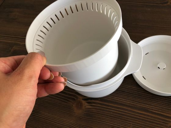 炊く前の準備はふつうの炊飯器とほぼ同じ。まず、一合の研いだお米と水200mlを入れて15分置きます。ちなみにお米を入れる部分には水切りもついているので、お米を研ぐときの手間もかかりません。