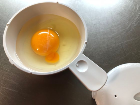 同シリーズからもうひとつ、「目玉焼きメーカー」もご紹介。使い方はこちらも簡単で、容器に卵を1個割入れます。卵の黄身・白身のそれぞれの膜を竹串や爪楊枝で十数か所穴をあけて500Wで約60秒チンするだけ。