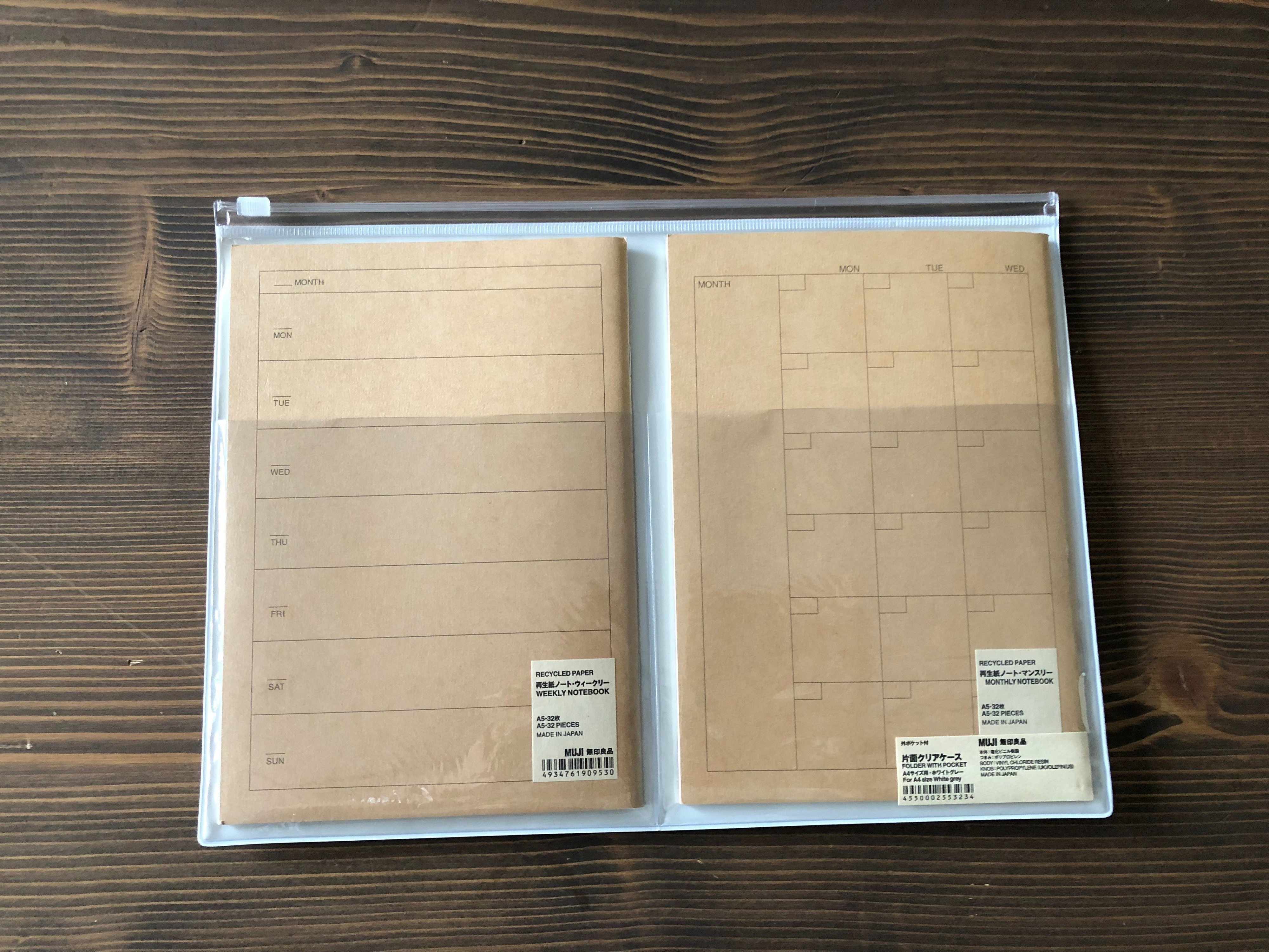 無印良品のマンスリー手帳。2019年用はフリーマンス形式を選んでみました。ちょっと書き込むのが面倒な感じもするかもしれませんが、曜日ごとに色を変えたり、仕事の内容によって色分けしたりと活用方法もたくさんあります。