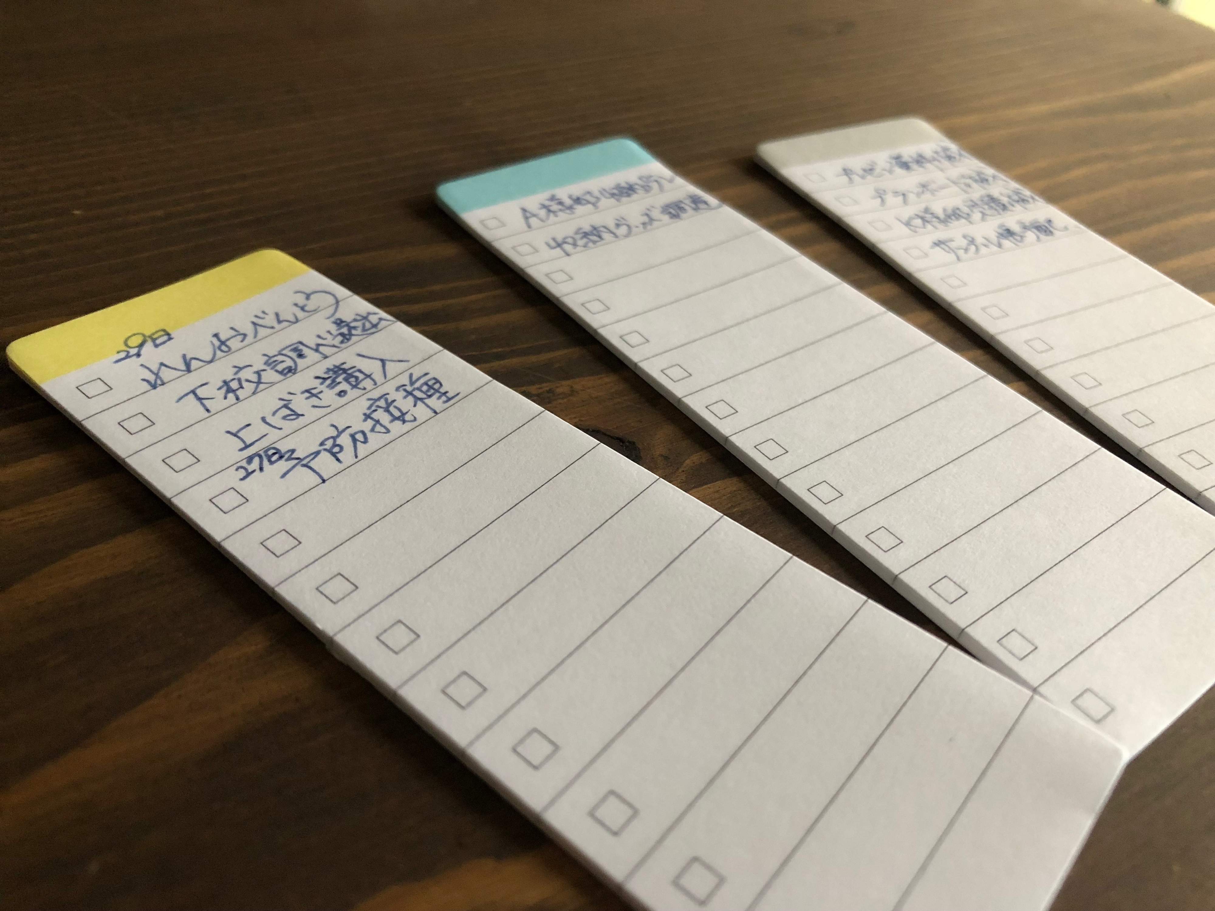 やらなきゃいけないことがいっぱい!手帳はそんなあなたの強い味方です。たとえば、チェックリスト付箋帳を使って忘れないようにTODO管理。3色なので仕事、こども、家事などジャンル別にわけるのもオススメです。