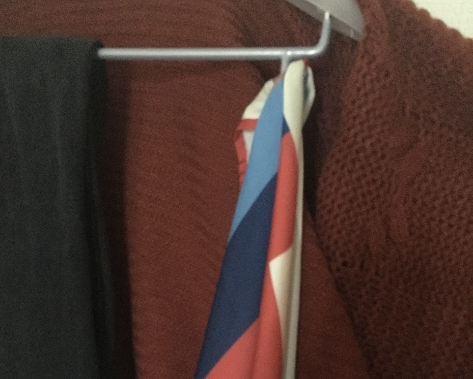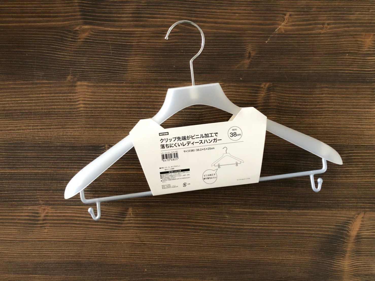 今回ご紹介するのは、ニトリで売っている「クリップ先端がビニール加工で落ちにくいレディースハンガー」。ポイントは“フック付き”なところ。太さも6センチあるので、秋冬物のニットも型くずれせずにかけられます。