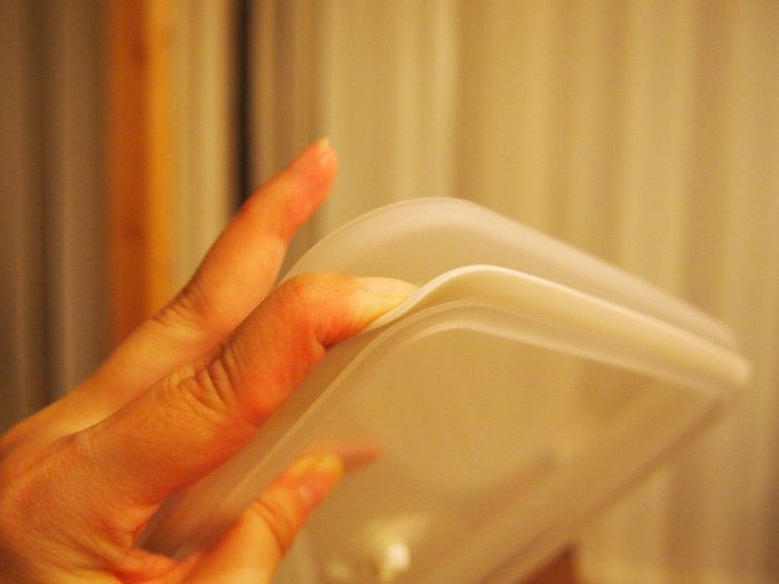 うちに大小あわせて合計7つも常備しているこの保存容器。液体も漏れにくく、ニオイに困ることもないところが最大の魅力!その秘密はバルブ付きという密閉性です。バルブが下がった状態ではフタが密閉し、開けることはできなくなっているのです。