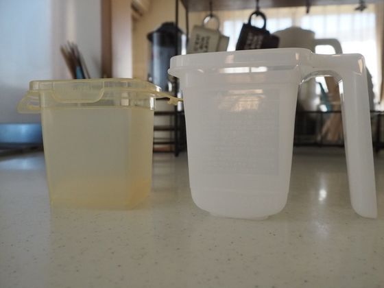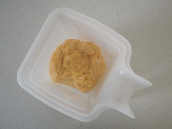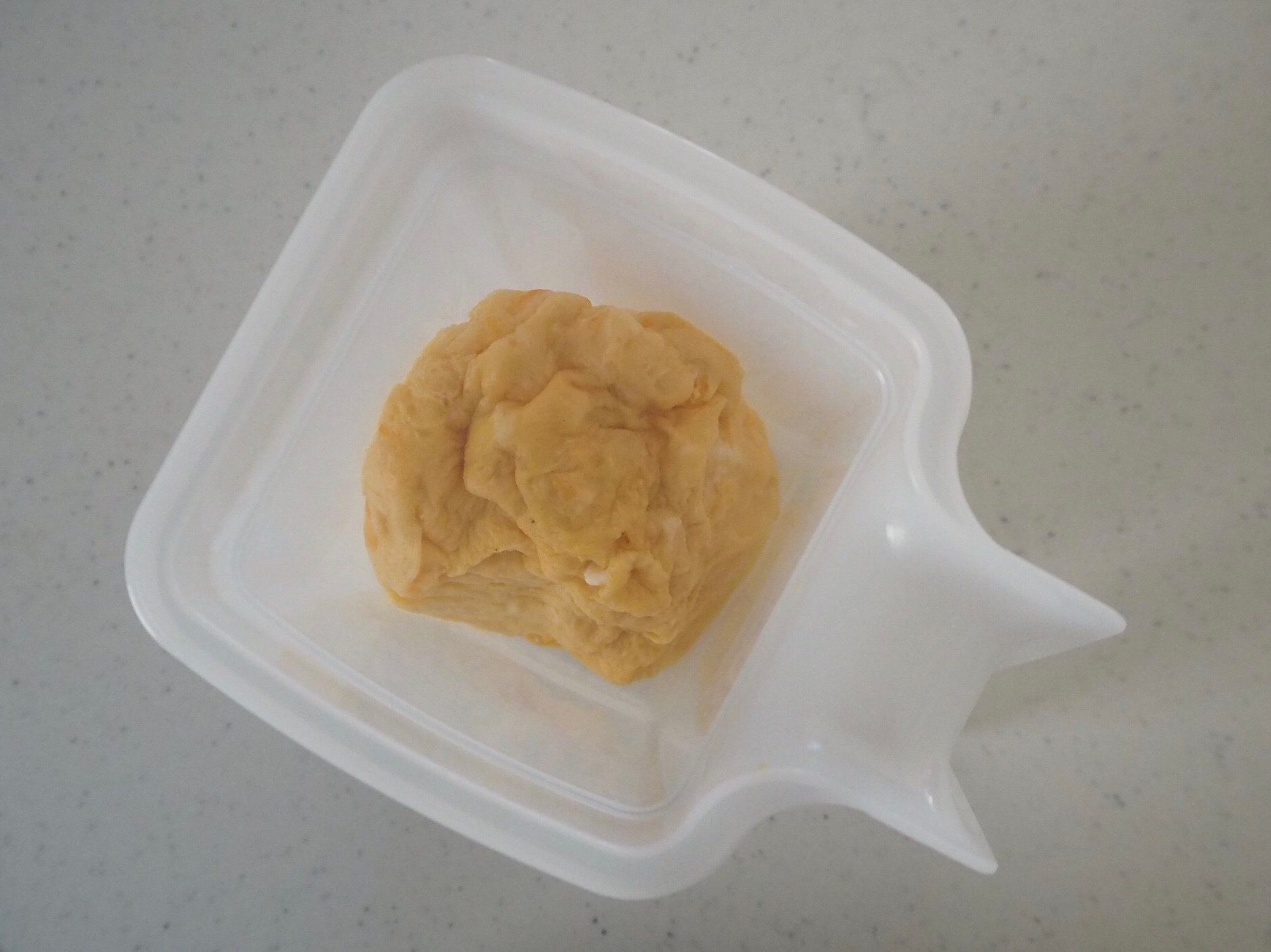 500Wで40秒加熱を2回するとこのような形に。これで本当にだし巻きたまごになるの?と思いきや、この後の工程に秘密が。