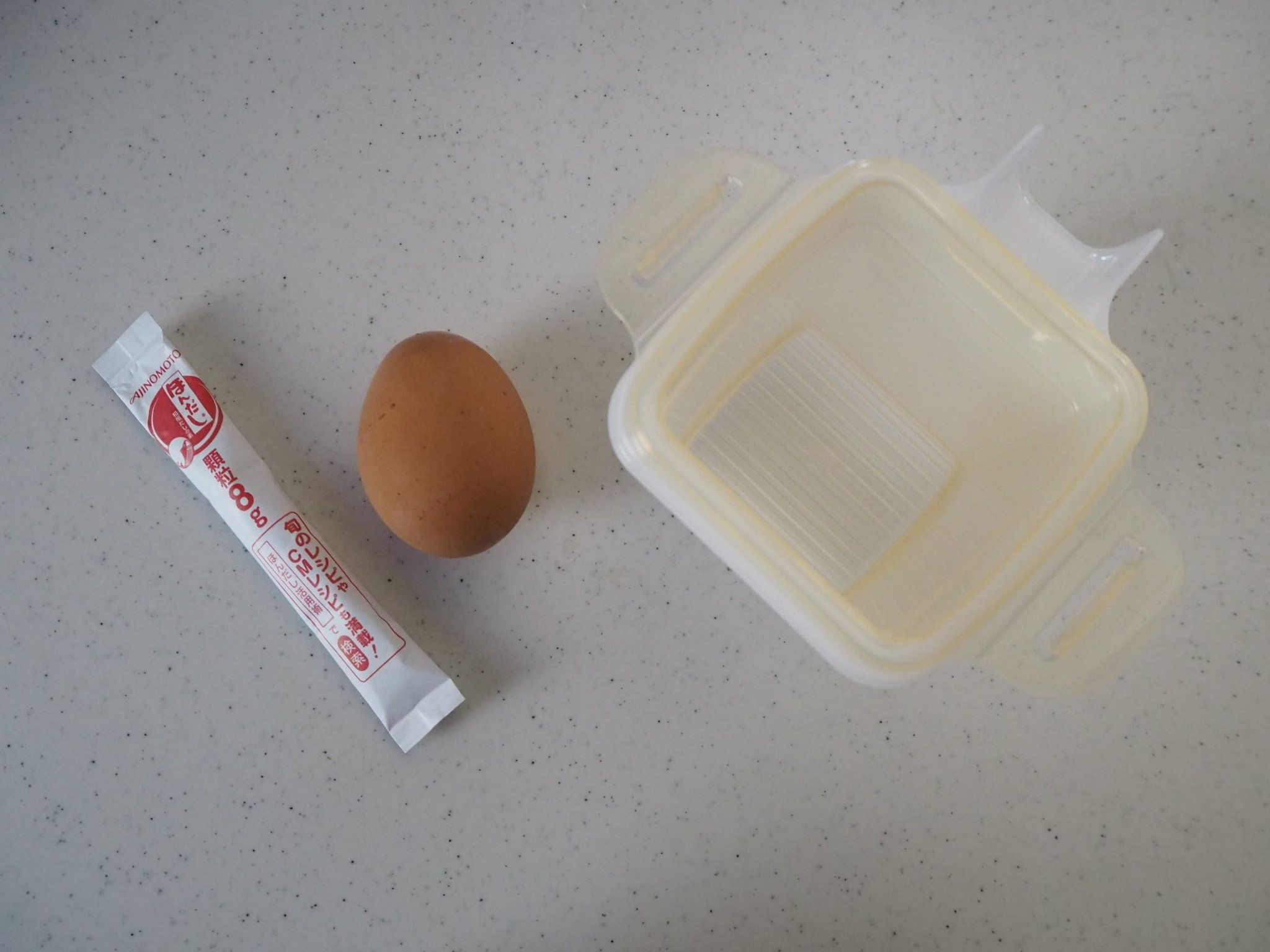 なんと卵1個でだし巻きたまごが作れちゃうんです。準備するのは卵1個と顆粒だしのみ!ここに水を足して出し巻き卵を作っていきます。