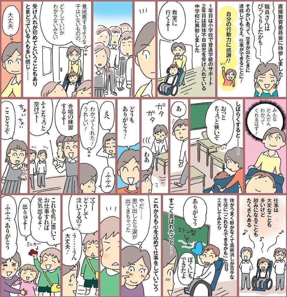 非常勤職員のスクールサポーター。公立中学校で体が不自由な生徒のサポートを行う。夫(33 歳)、長男(6歳)、長女(3歳)の4人家族