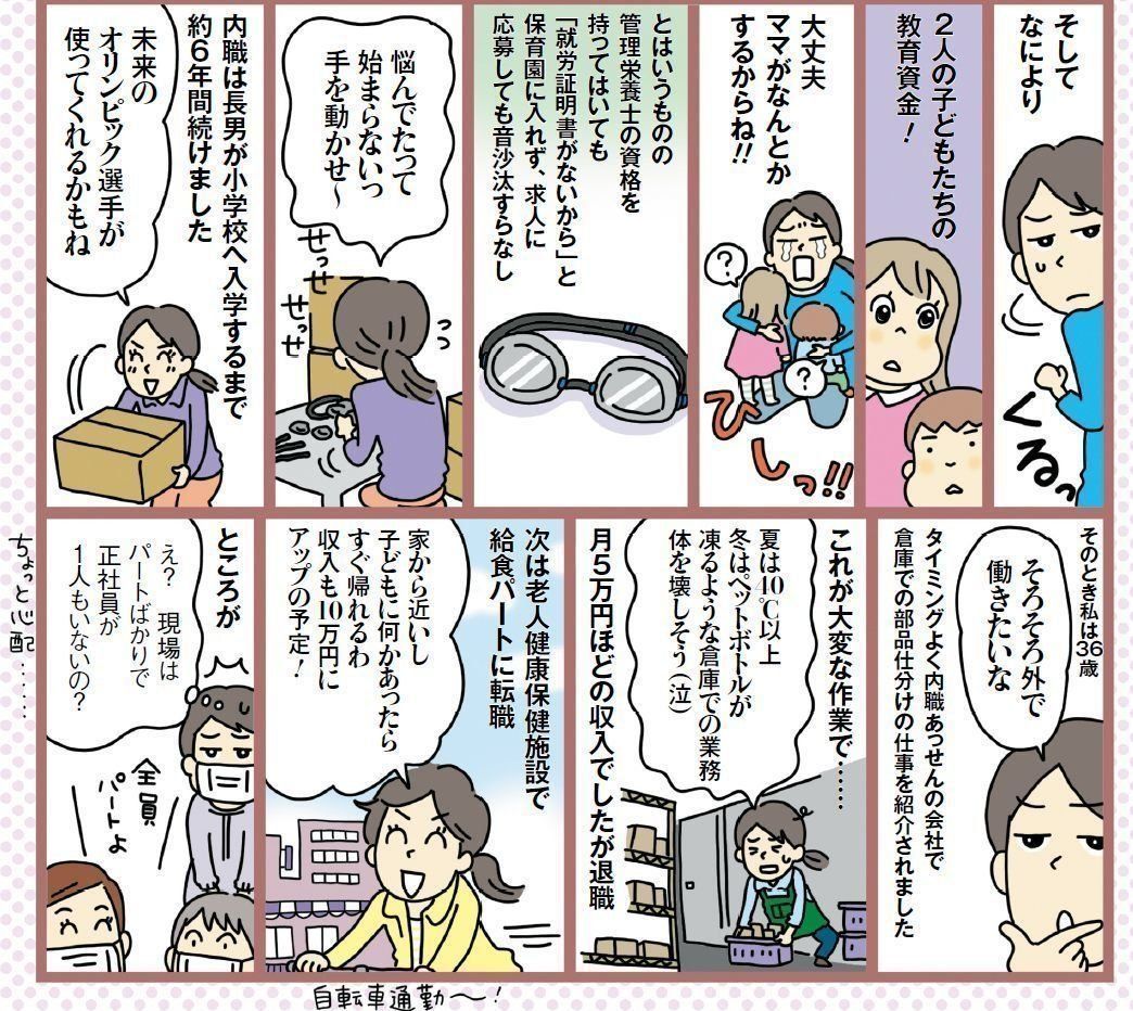 大学で管理栄養士の資格を取得。卒業後ホテルなどで働く。24歳で結婚。26歳で長女を妊娠し退職。29歳で長男出産。31歳で仕事再開。内職やパートなど4つの職場を経て39歳で理想の現職をGET。