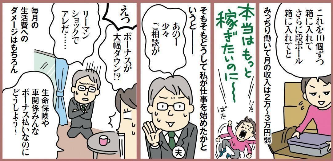 保育園の給食室での調理補助パート。週5日、8:30 から13:00 まで時短で働いている。夫(40歳)、長女(12歳)、長男(10歳)の4 人家族