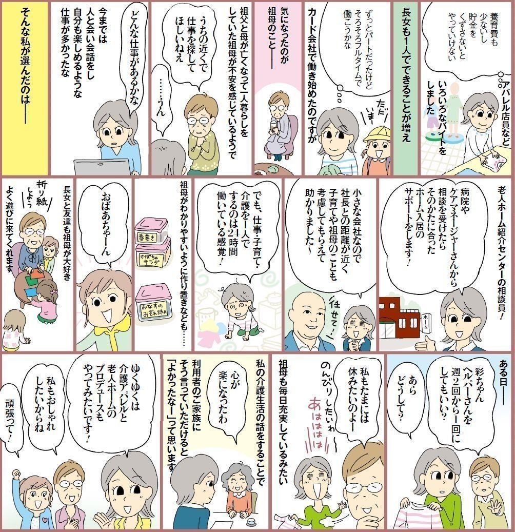 神戸老人ホーム紹介センターの相談員。祖母(86歳)、長女(10 歳)の3人家族。シングルマザーとして生活を支えている