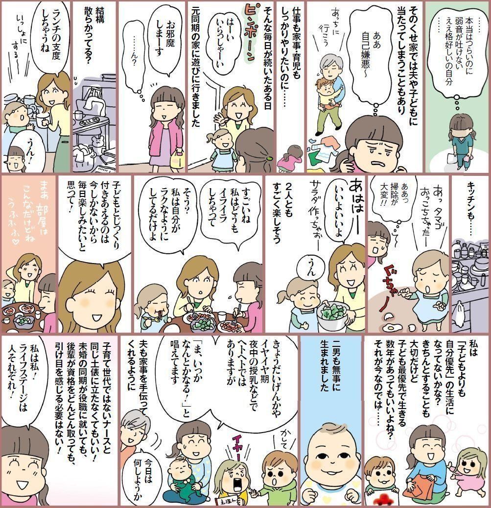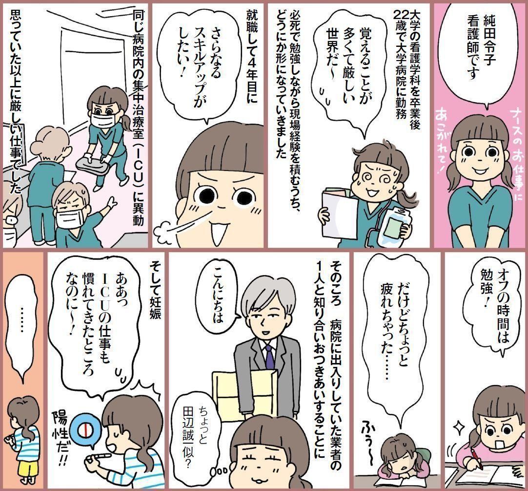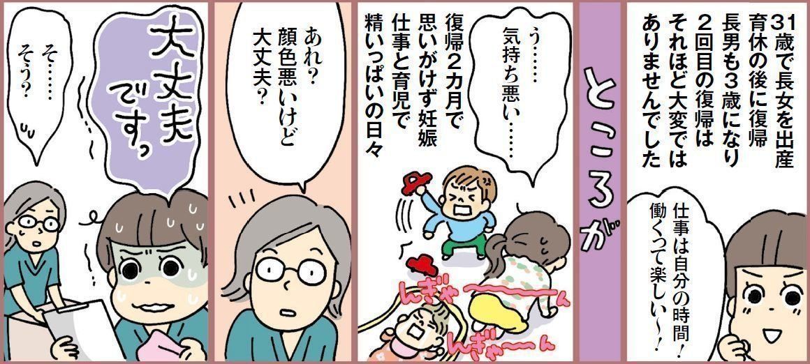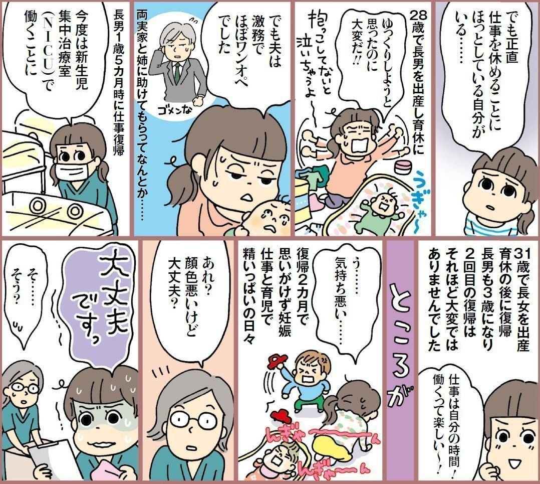 大学の看護学科を卒業後、大学病院に就職。27 歳で結婚し、28 歳で長男、31 歳で長女を出産。それぞれ産休・育休を取得し、復帰後は8 時半~ 16 時15 分の時短で働く。33 歳で二男を出産し、現在は育休中