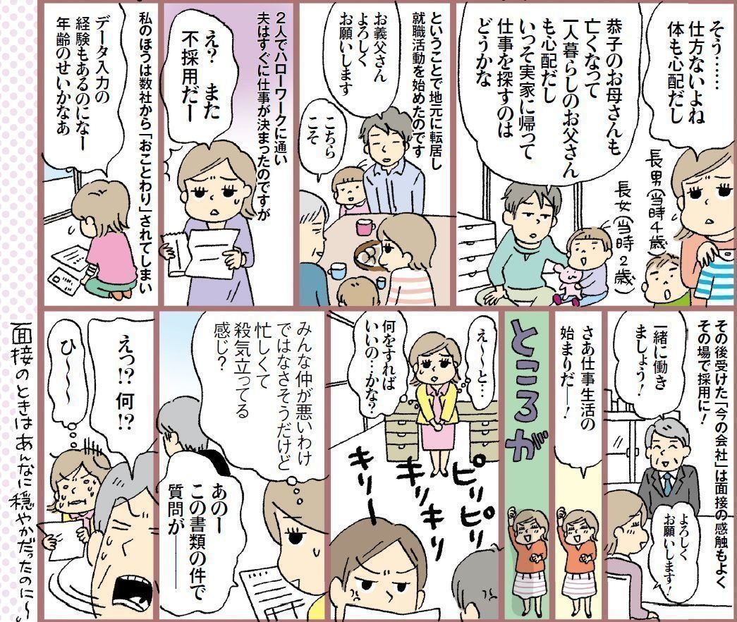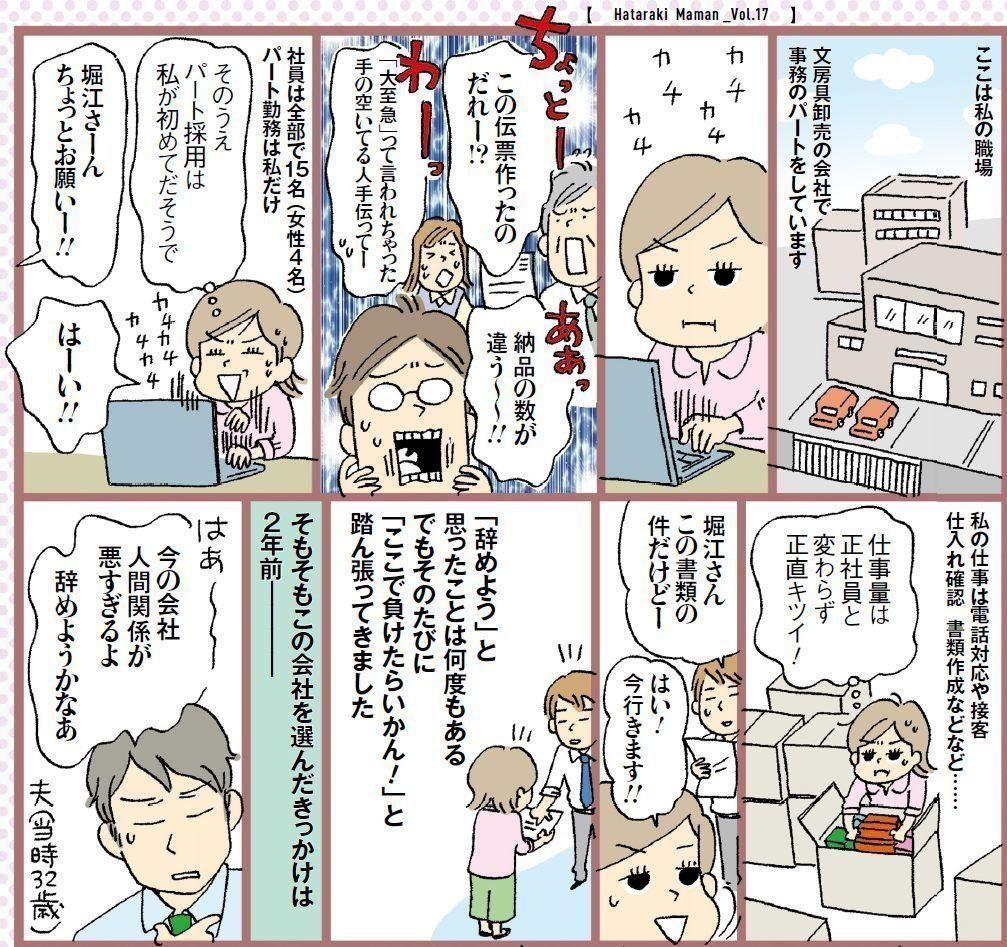 文房具の卸売会社の事務パート。週5日、9~16 時で働く。夫(33 歳)、長男(6 歳)長女(4歳)、実父(68 歳)の5人家族