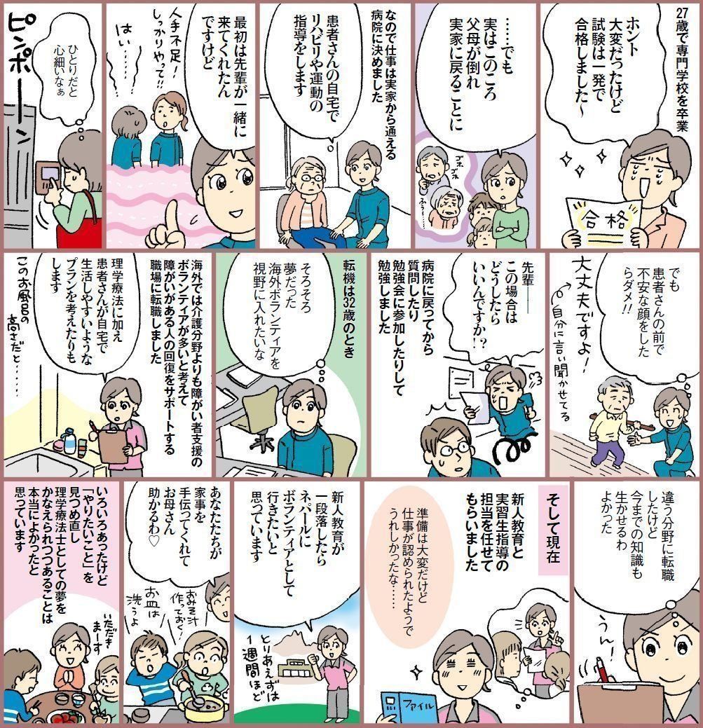 高校卒業後、旅館に就職して仲居になる。19 歳で結婚し長男を出産。育休を取り出産後3カ月で仕事復帰。22 歳で退職し長女出産、のち離婚を経験。23 歳で理学療法士養成の専門学校に入学。27 歳で資格を取り病院に就職。32 歳で現在の職場に転職