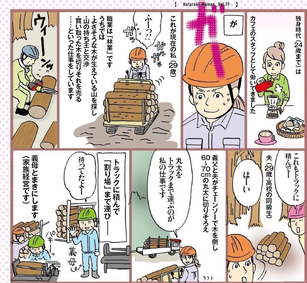 高校卒業後スーパーの正社員になりレジを担当。22 歳で退職後、2年間カフェでバイトし接客と調理を担当。店長代理も務める。24 歳で結婚退職し、長女を出産。産後3カ月から林業の手伝いをスタート