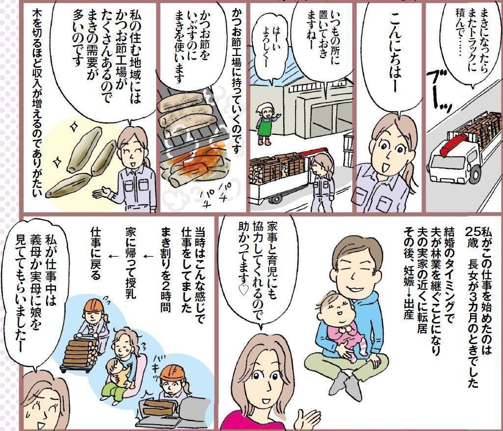 家族経営の林業。かつお節工場に卸すまきを作る。1日4~8時間くらい、夫の扶養の範囲内で働く。夫(29 歳)、長女(4歳)の3人家族