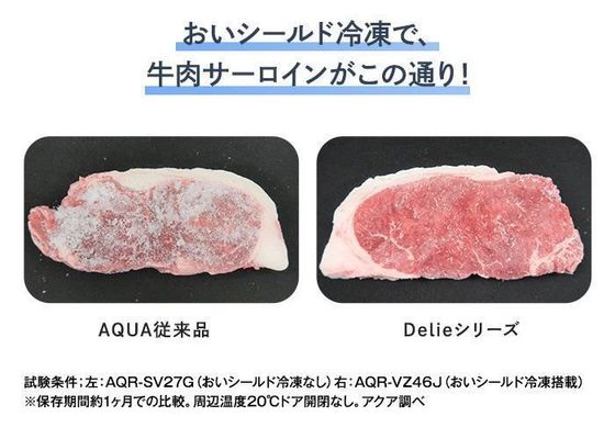 AQUAのDelieシリーズは、霜取り運転時、暖気が冷凍庫内に入るのを防ぐしかけが満載。食品のおいしさを、約-30℃の冷気で一気に閉じ込める「おいシールド冷凍」、霜の原因となる温度変化を抑えて霜がつきにくくする「ドリップ抑制機能」で鮮度を1カ月保持。冷凍食品のおいしさを長期間キープすることに成功しました。