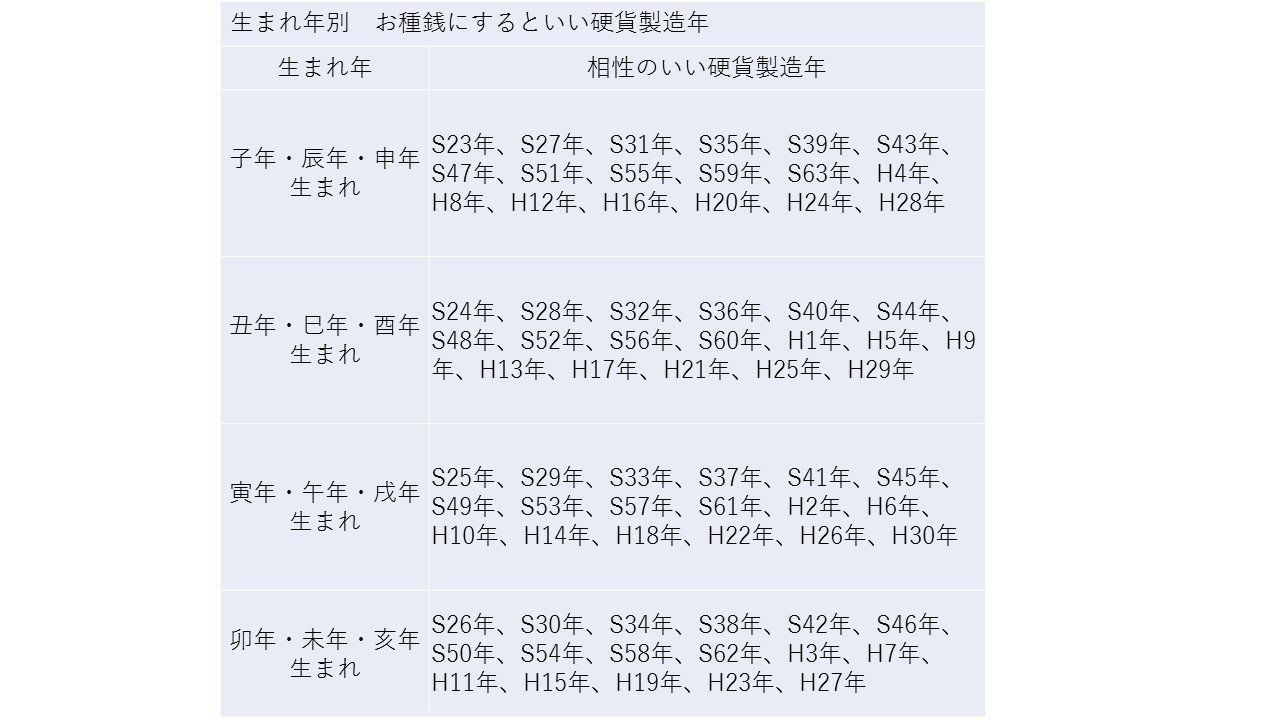 たとえば、子(ね)年生まれなら、相性がいいのは子年、辰(たつ)年、申(さる)年。この3つの干支に該当する年に製造された硬貨でお種銭を作ります(別表参照)。