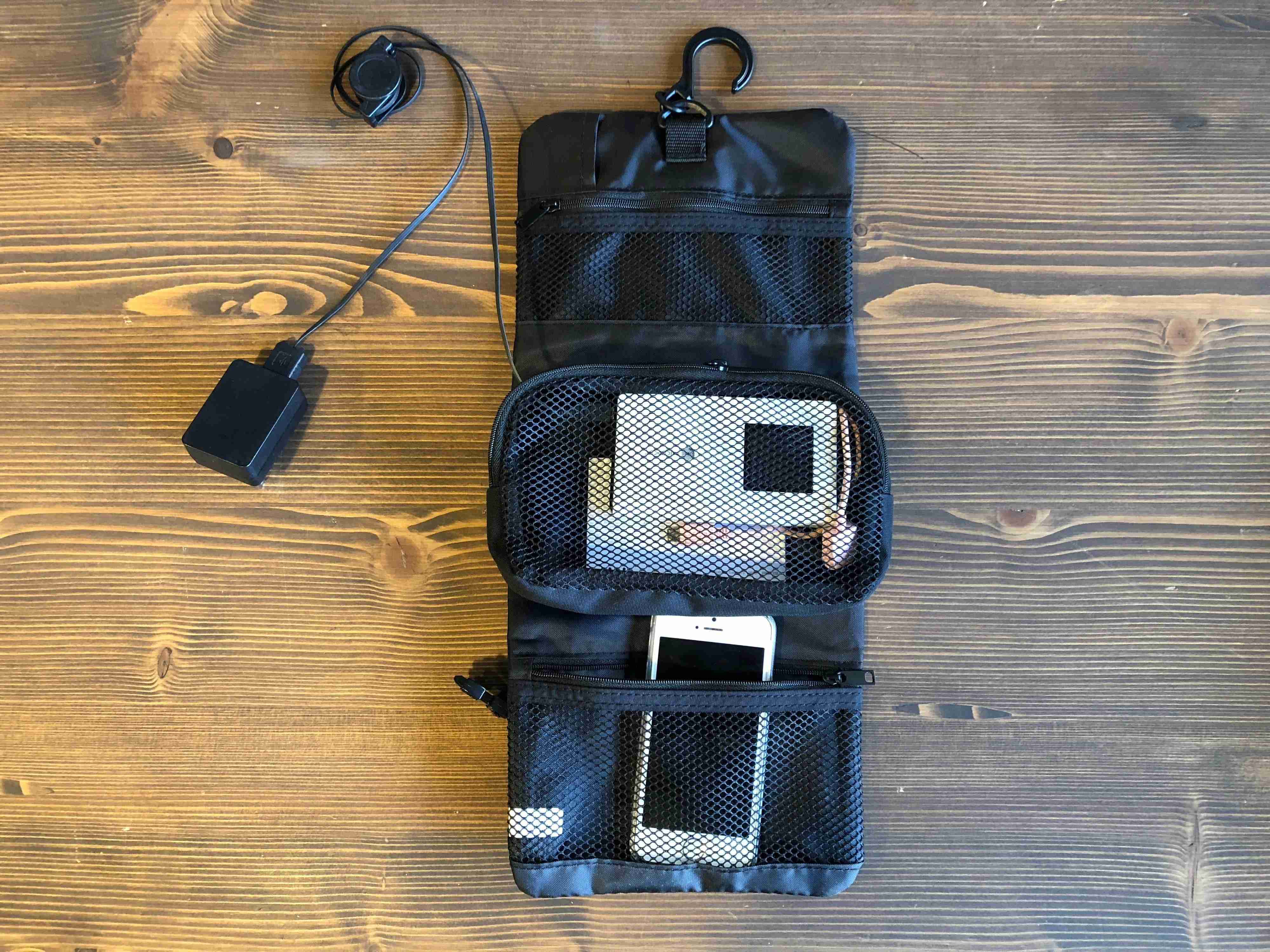 ポケットWi-Fi、充電器、イヤホン、コードにケータイも楽々収納出来ます。フック付きだから充電しながら掛けておけます。出かける時に必要なものを入れ、真ん中のポーチだけを外す事も可能!