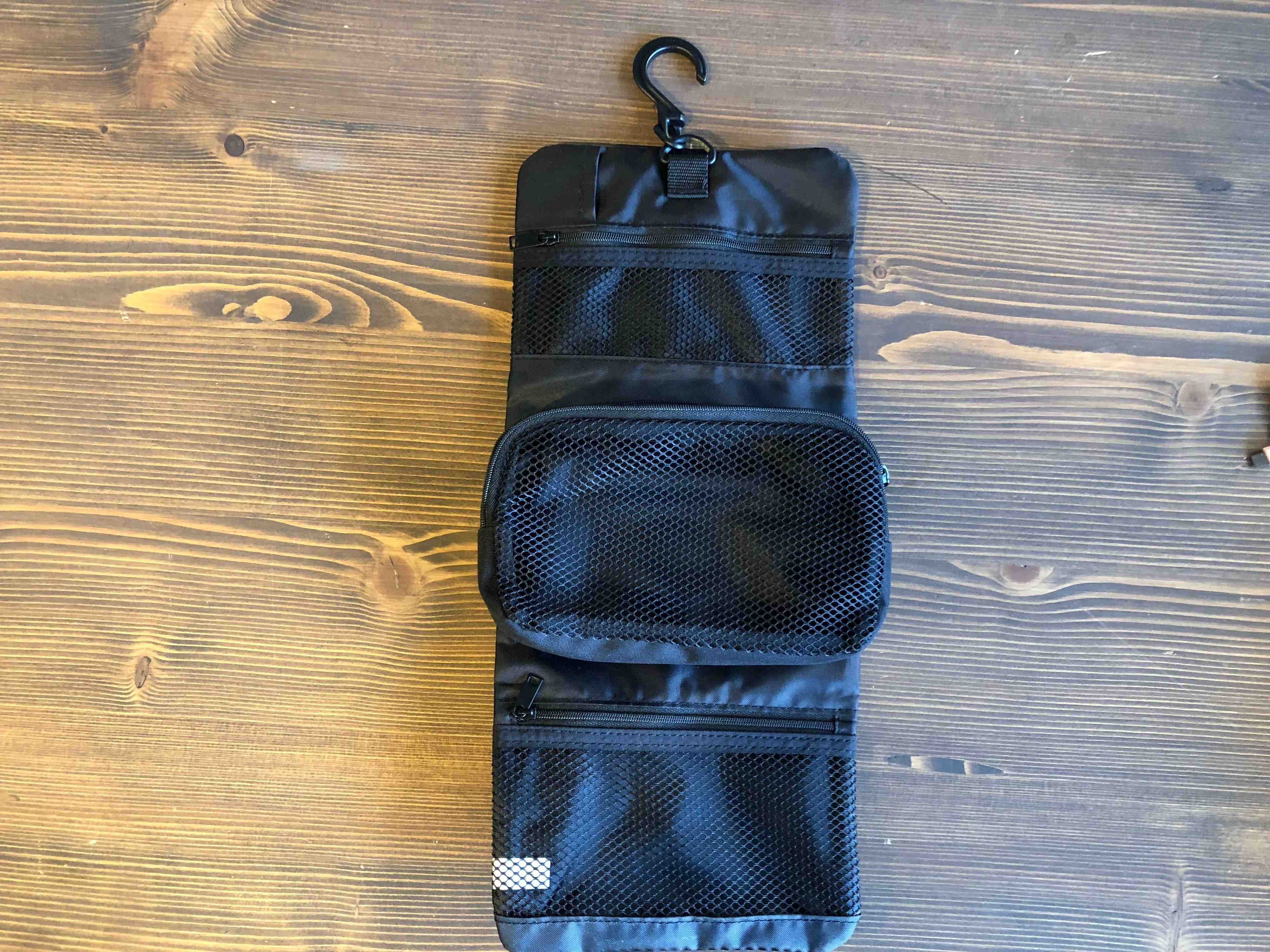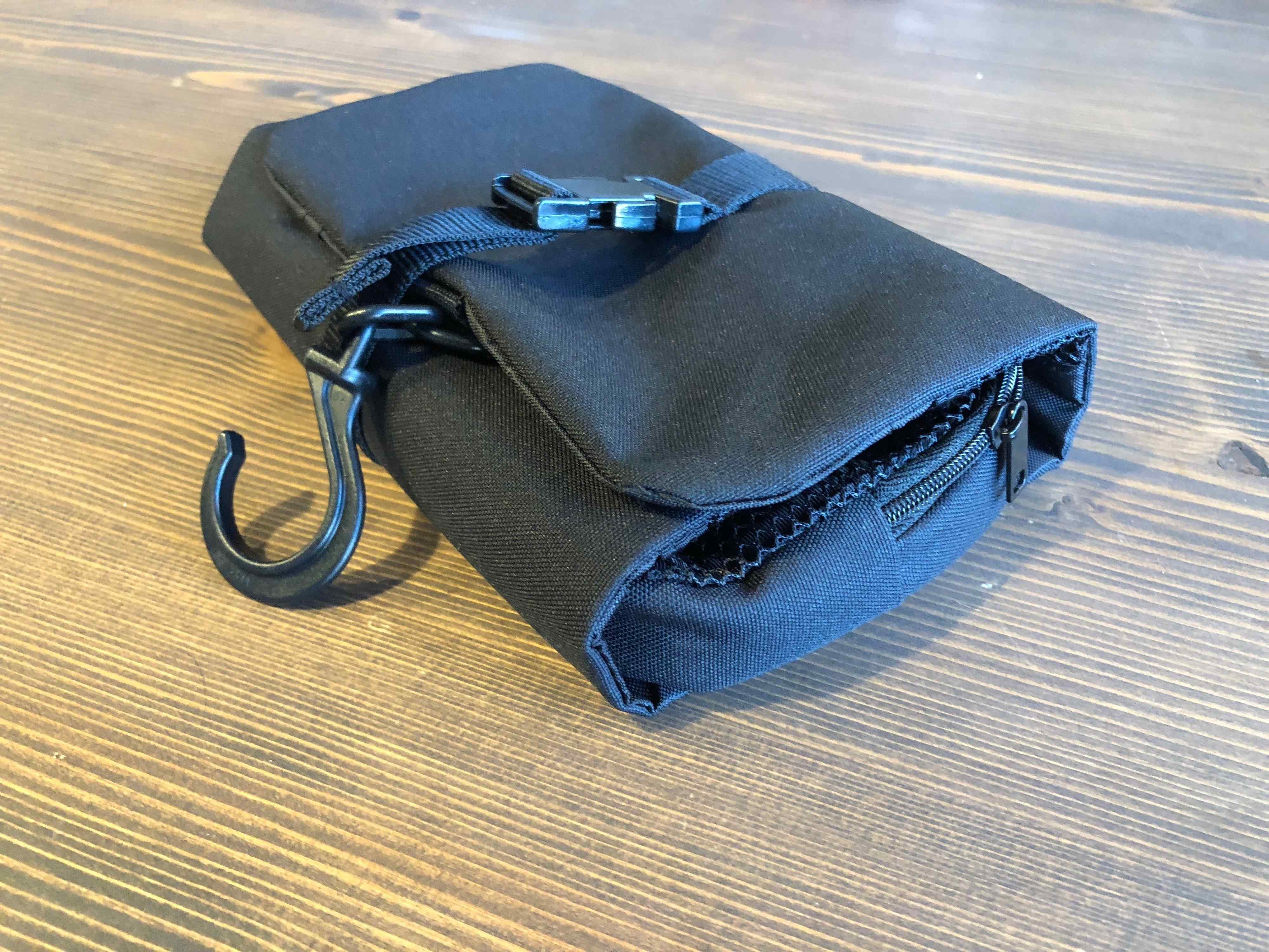 今回使用するのは無印良品の「ポリエステル吊るせるケース着脱ポーチ付」(¥1590・税込み)です。写真でもわかるとおり、フックが付いているのが特徴的。