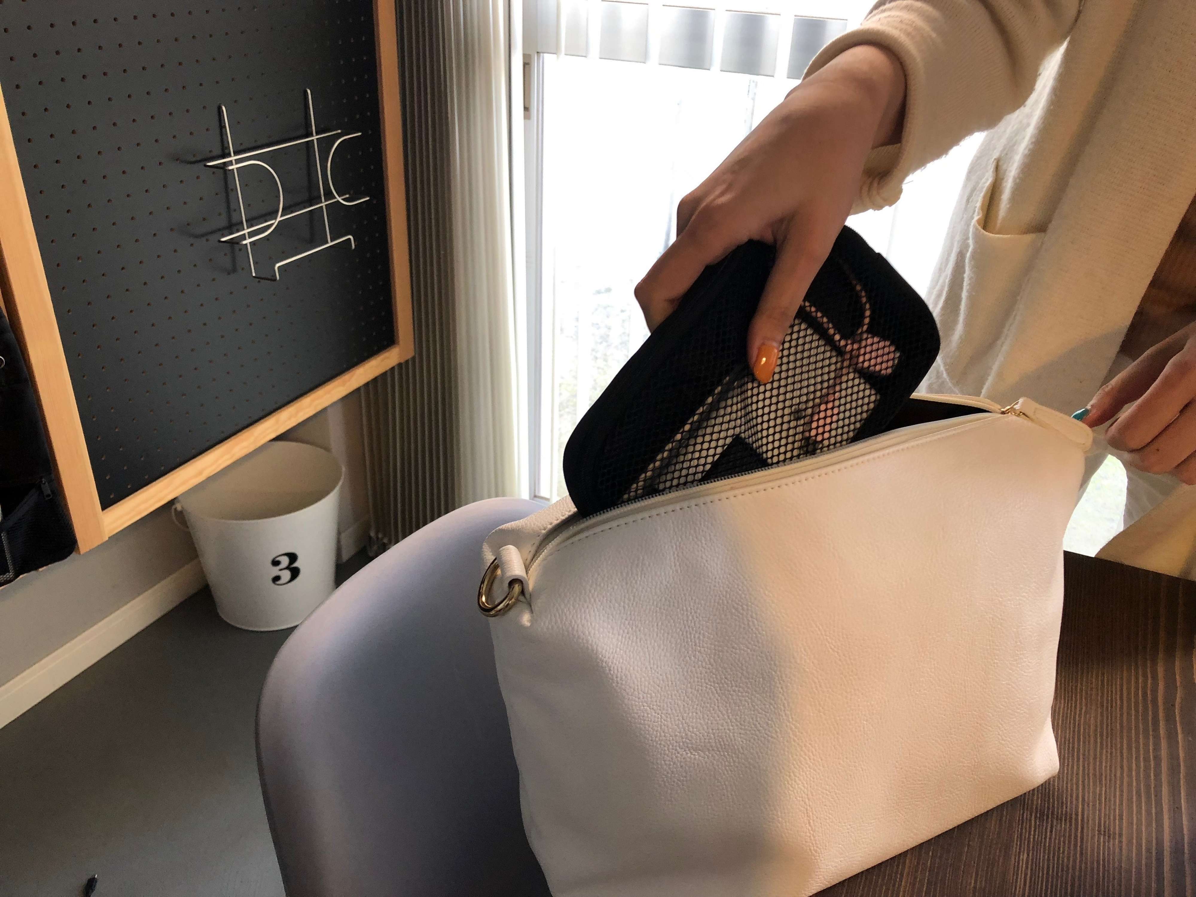 ポーチだけをバッグの中に入れたら持ち運びも楽々!ひとまとめにしておくと忘れ物をしにくいですよね。メッシュ生地のポーチだからバッグの中でも出し入れしやすいです。
