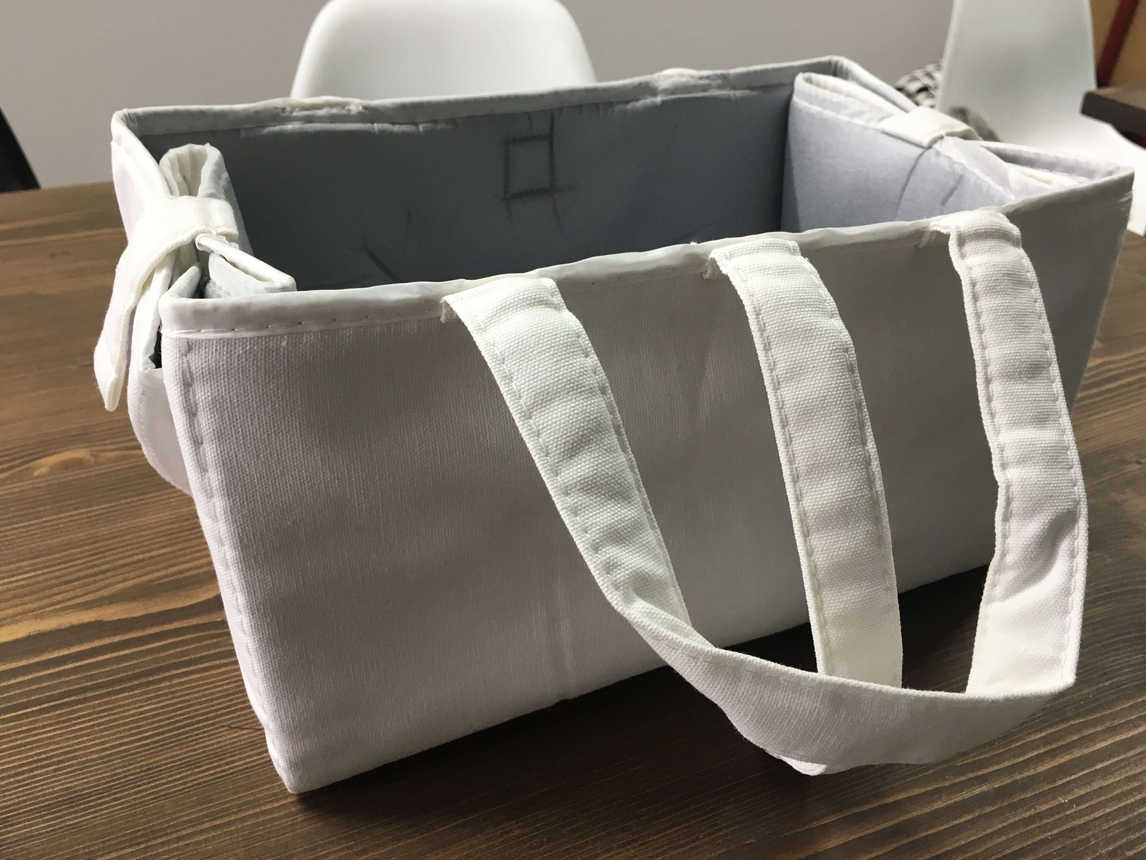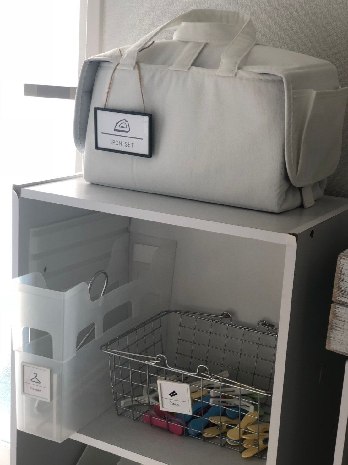 全部白いので、分かりやすく「アイロンセット」と書いたラベルプレートを持ち手に。洗濯を干す時のグッズと一緒にしておくと、使いたい時にすぐに取り出せますし、バッグ型だからボックスごと運んで家の中の持ち運びも楽々!