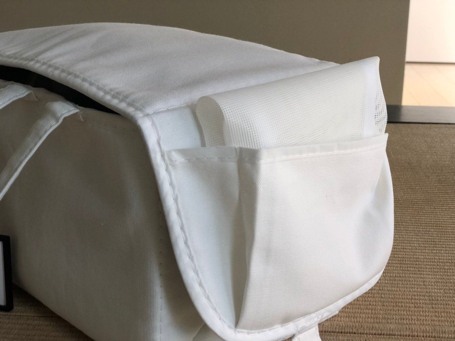 アイロンが入ったら、フタをします。フタ部分にポケットが付いているので、こちらにアイロンあて布を収納!