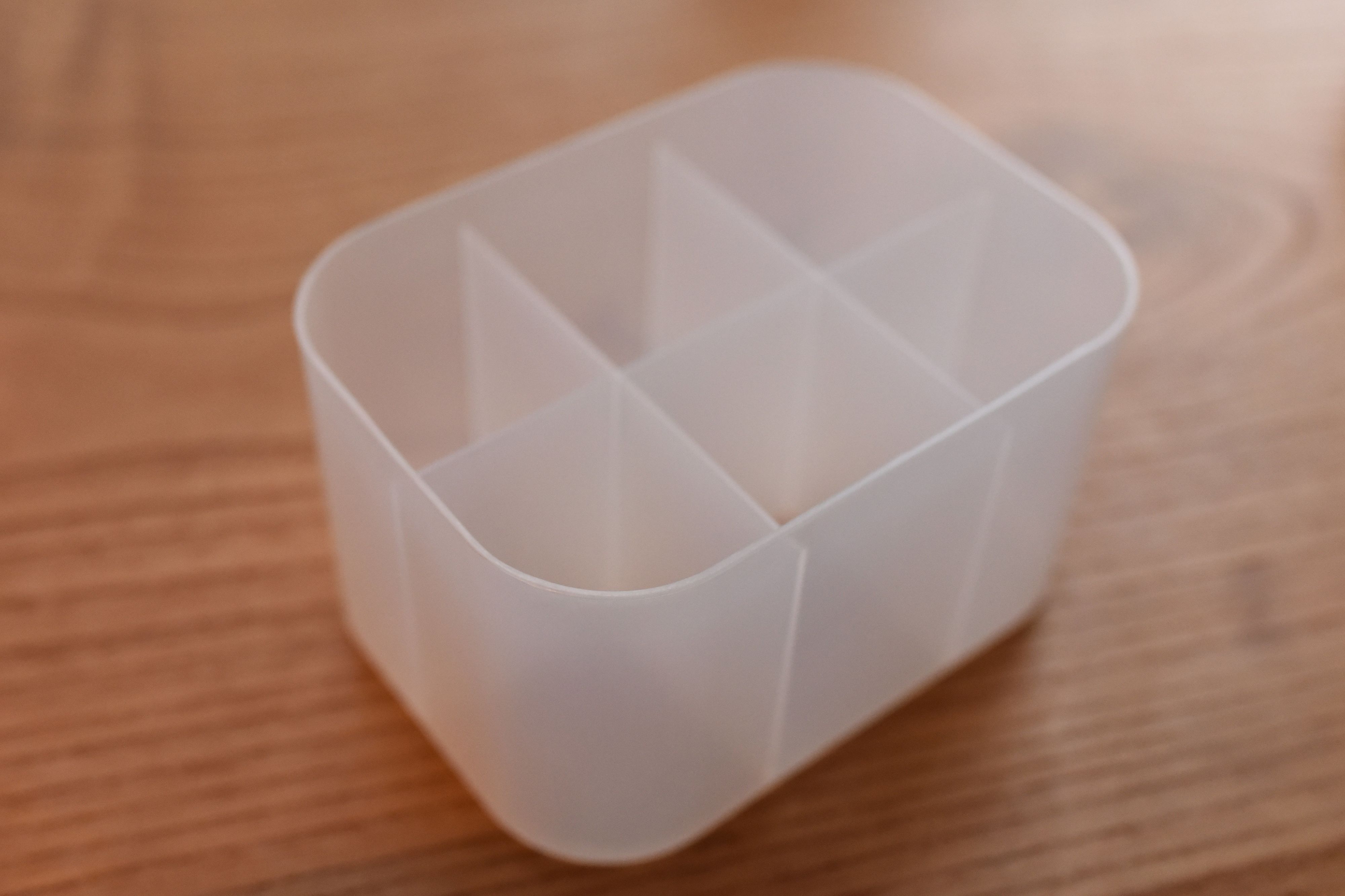 私が使っているのは、100均一店で販売されている、6つに分かれているプラスチックケースです。これを使用する前は、引き出しにラップなどと並べて収納していました。