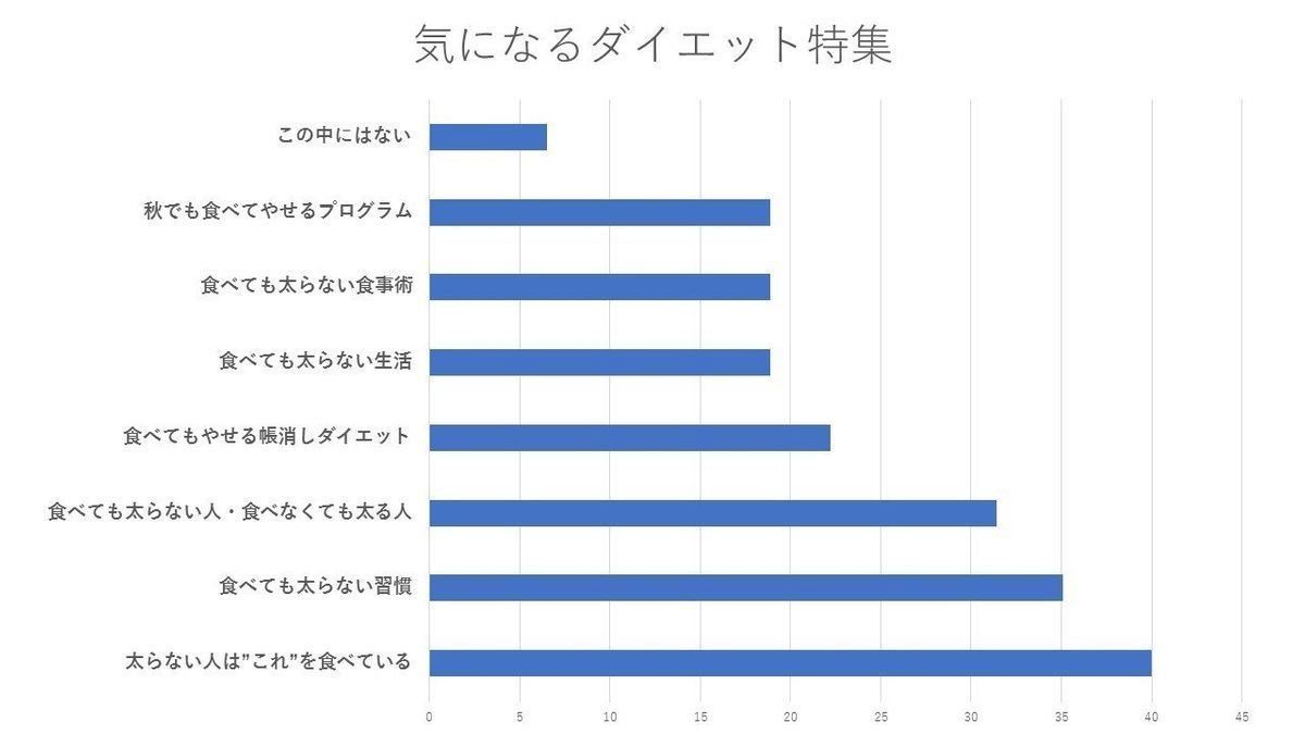 7つのダイエットから、気になるものを1人3つずつを選んでもらったところ、「太らない人は“これ”を食べている」が40.0%でトップに。